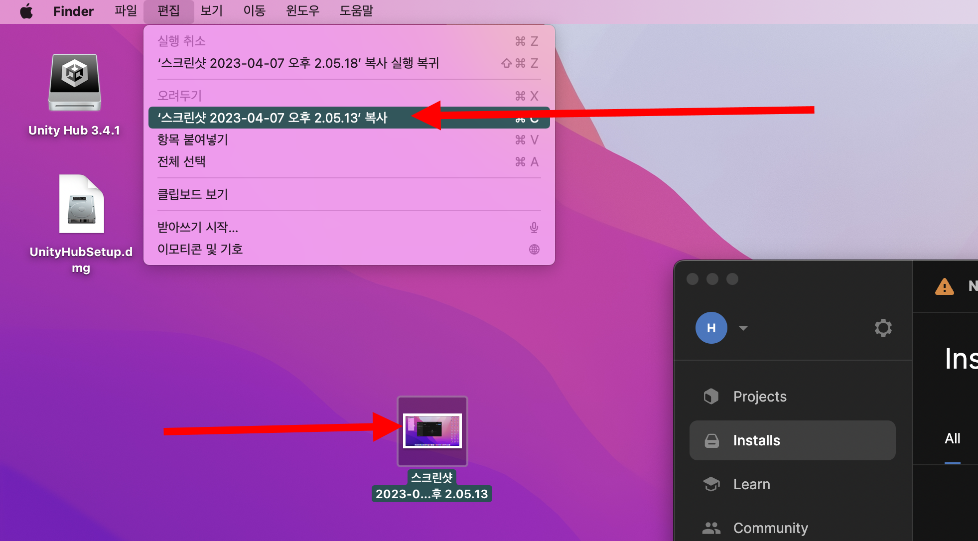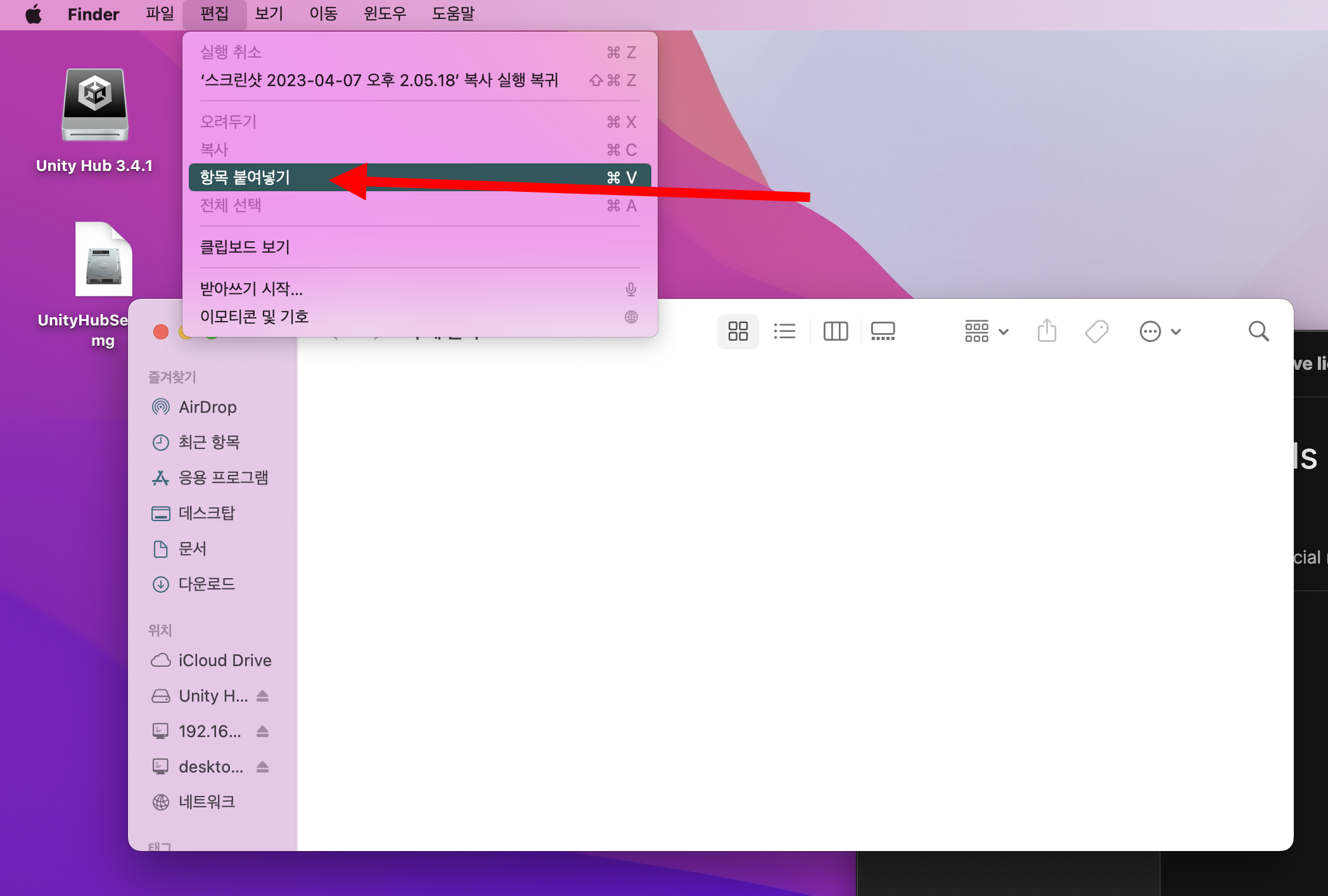 4)복사한 파일을 붙여넣기하려면 상단의 편집 메뉴에서 항목 붙여넣기를 선택합니다(키보드 단축키 command + V)