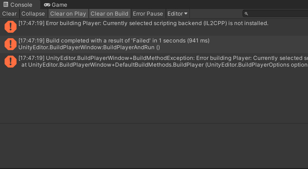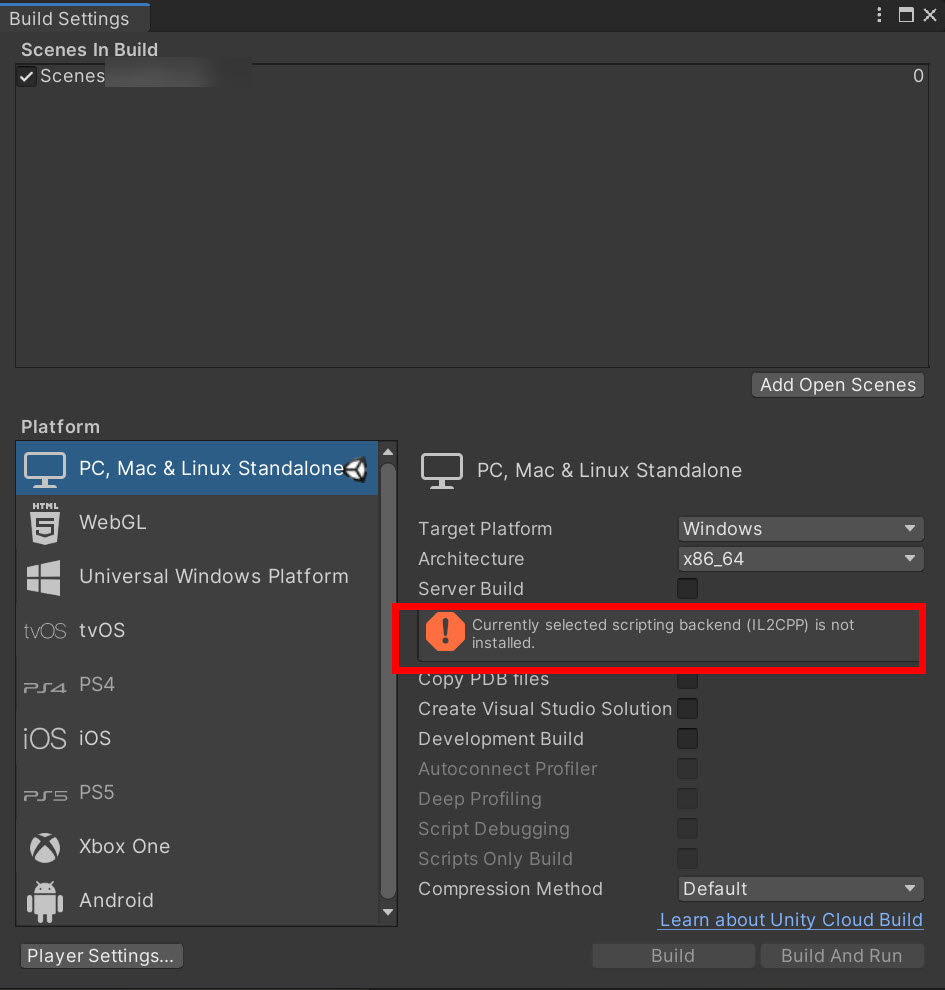 유니티 빌드 오류 currently selected scripting backend(IL2CPP) is not installed