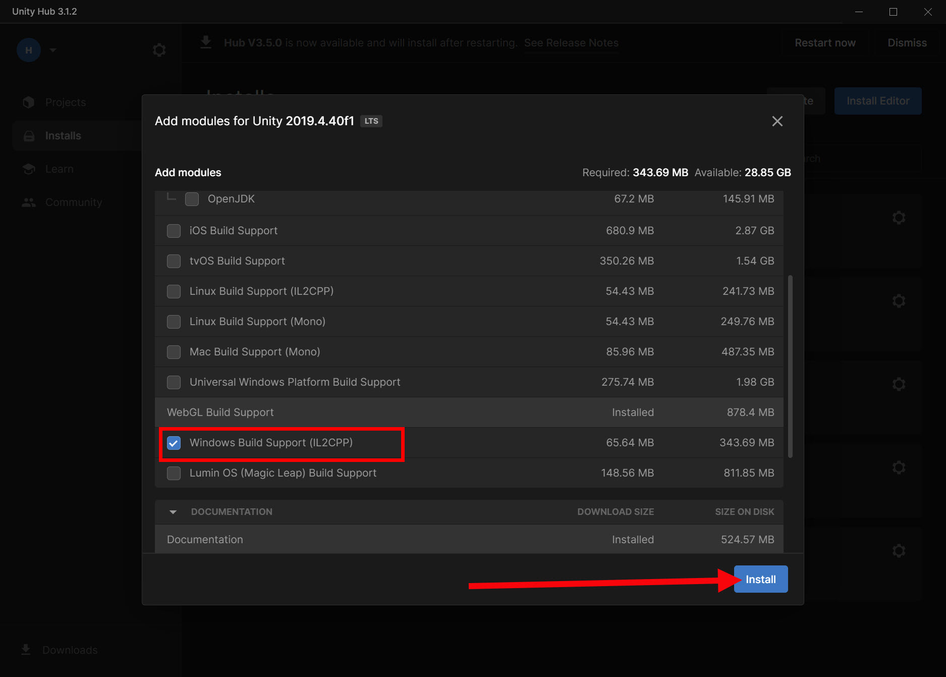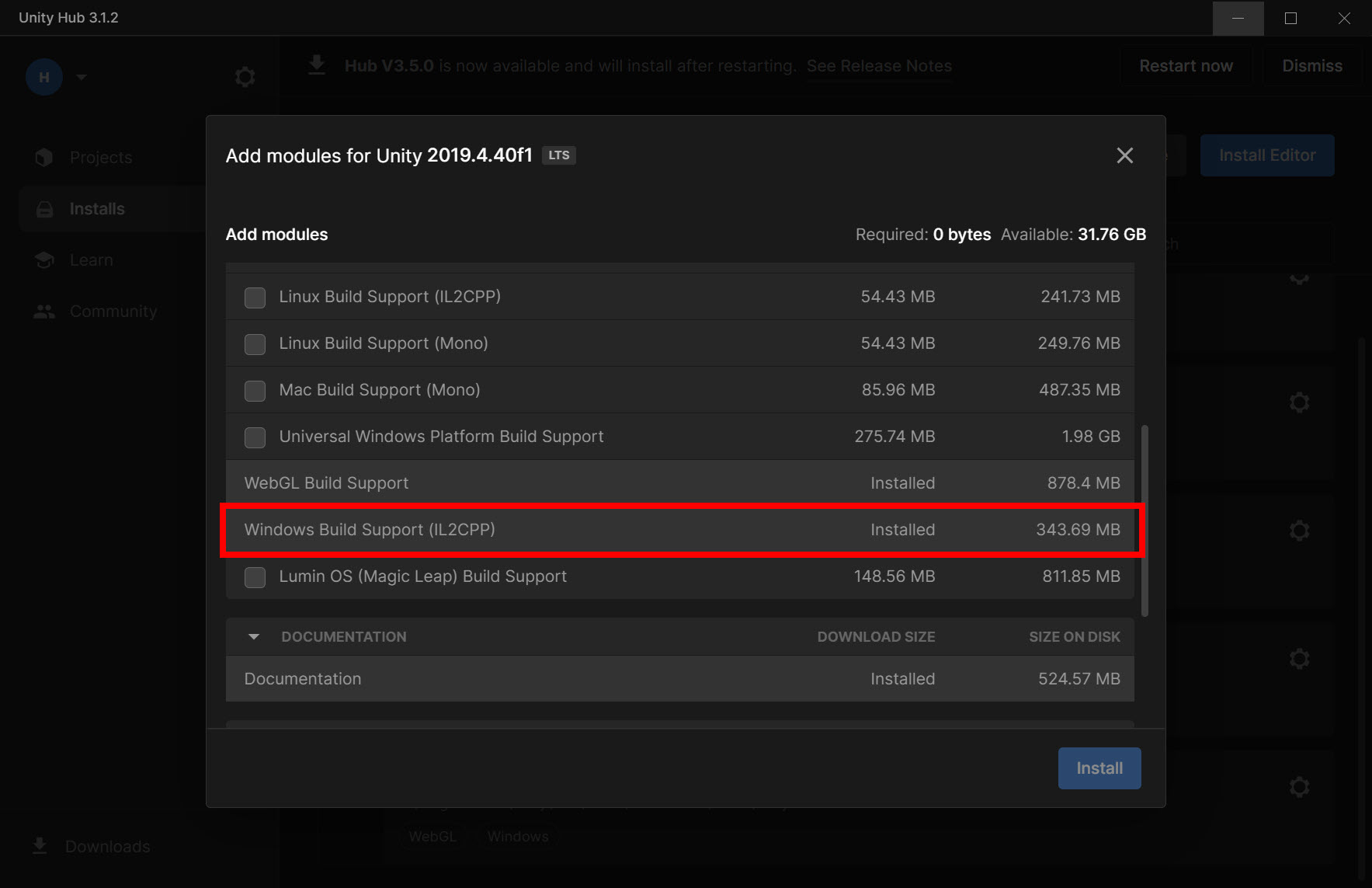 5)플랫폼에 대한 build support(IL2CPP)를 선택하고 install을 클릭하면 해당 모듈을 설치합니다.