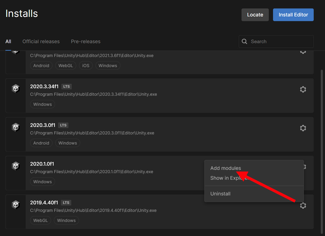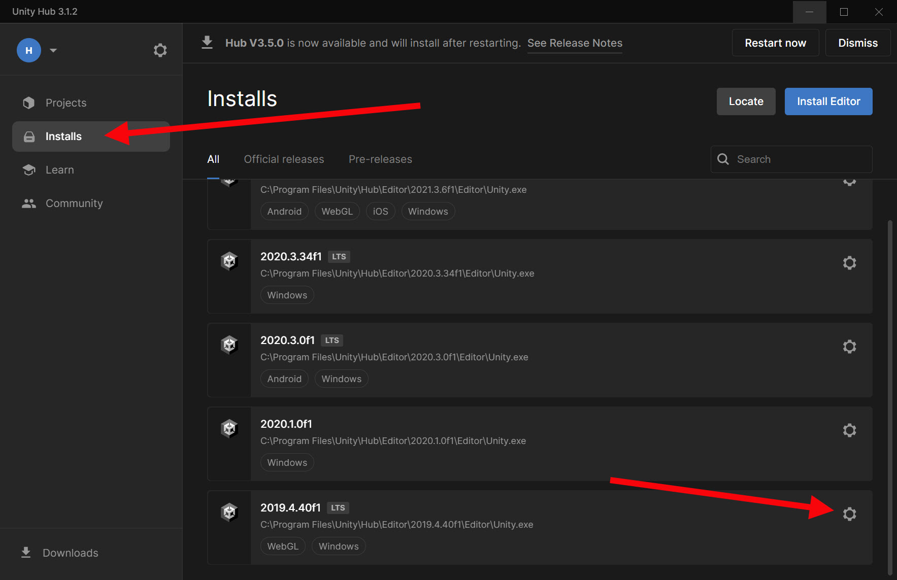 3)유니티 허브의 설치(installs) 메뉴에서 현재 프로젝트의 유니티 에디터 버전의 설정 버튼을 클릭합니다.