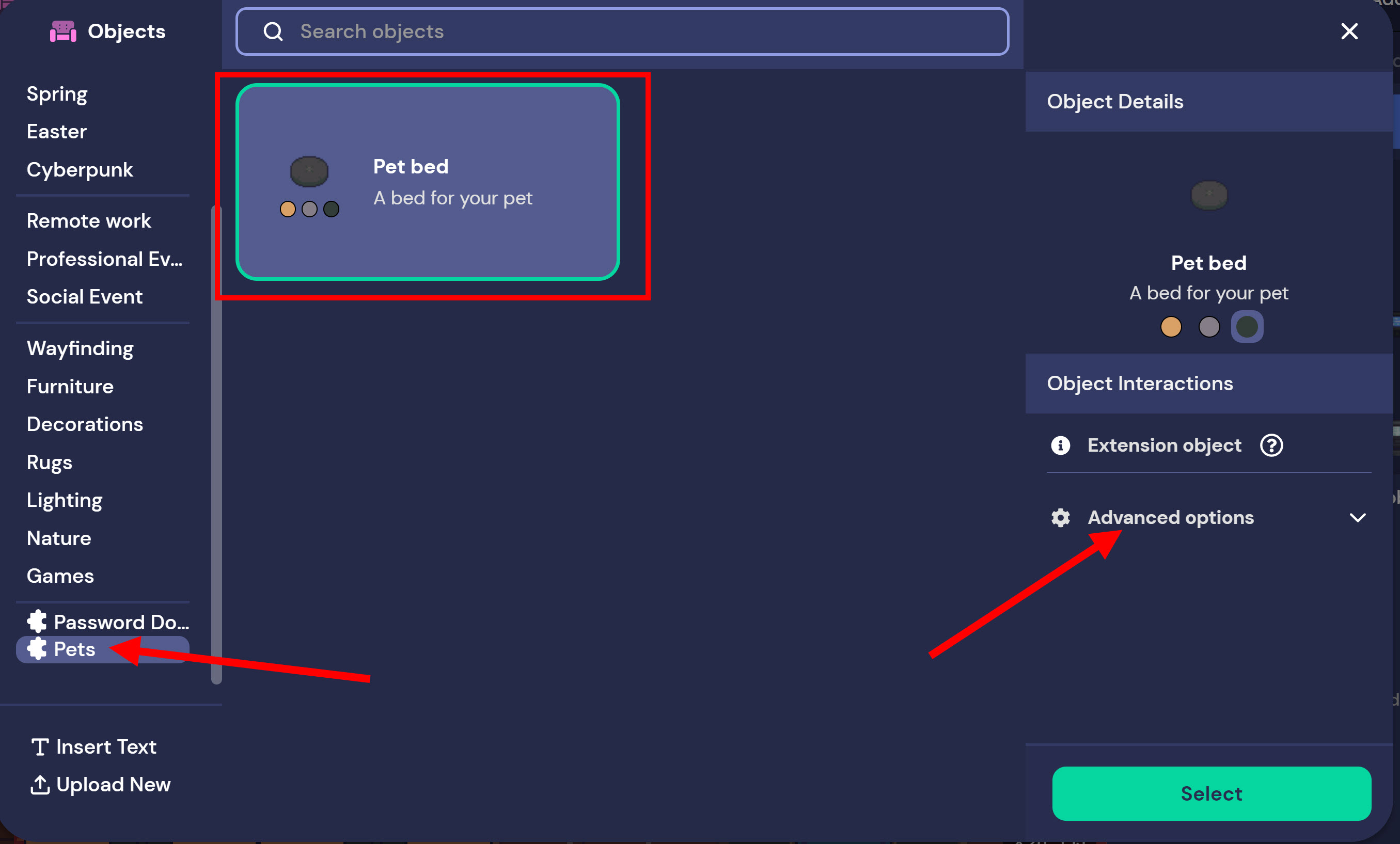 4)pets의 pet bed 오브젝트를 선택하고 우측의 advanced options를 표시합니다.