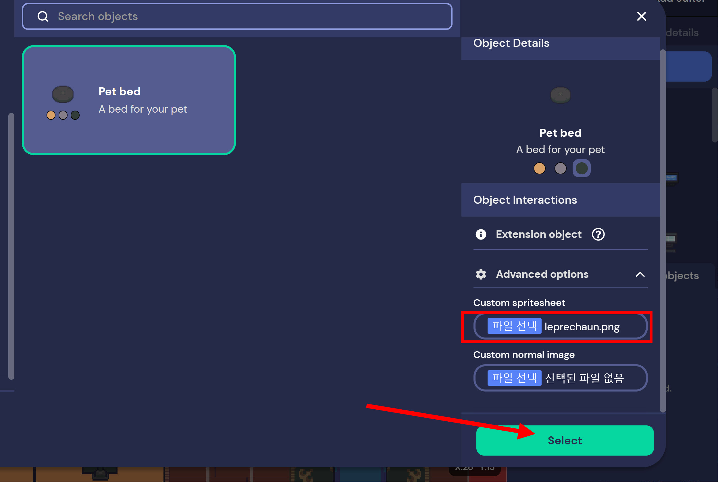 5)custom spritesheet에서 사용자 정의 펫 스프라이트시트 이미지를 설정합니다.