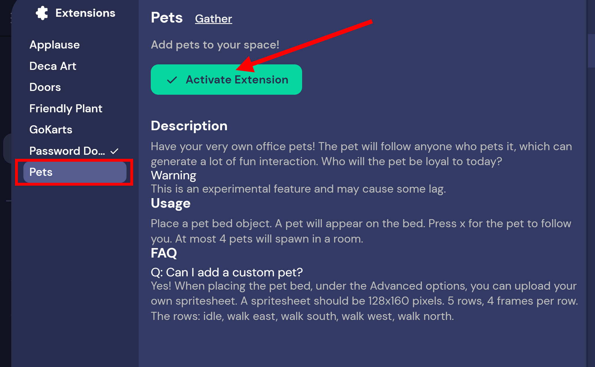 2)pets extension을 활성화합니다.
