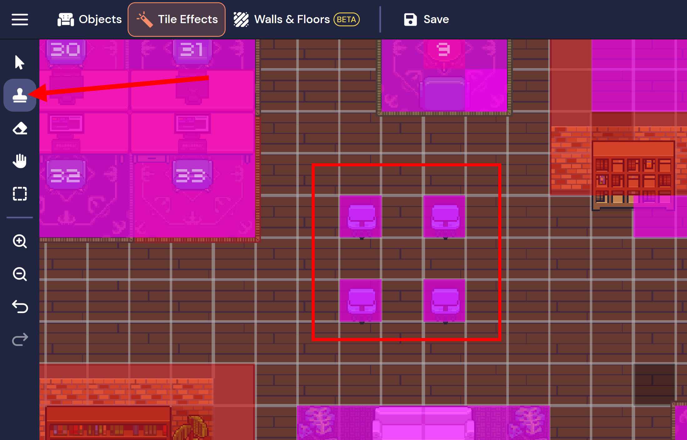 1)맵메이커에서 상단의 tile effects를 선택하고 private area 타일 이펙트를 선택합니다.