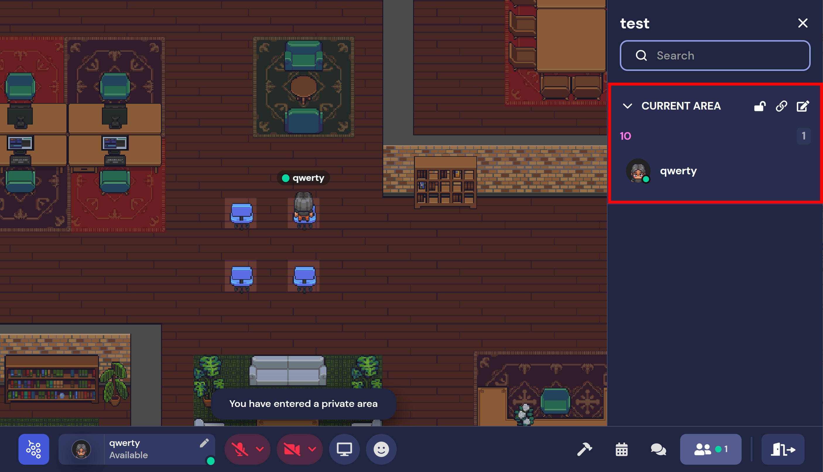5)사적 영역 타일 위에 있는 사용자들은 개인적으로 연결될수있으며 우측의 참가자 목록에서 사적 영역의 ID(10)와 해당 영역에 있는 사용자들을 표시합니다.