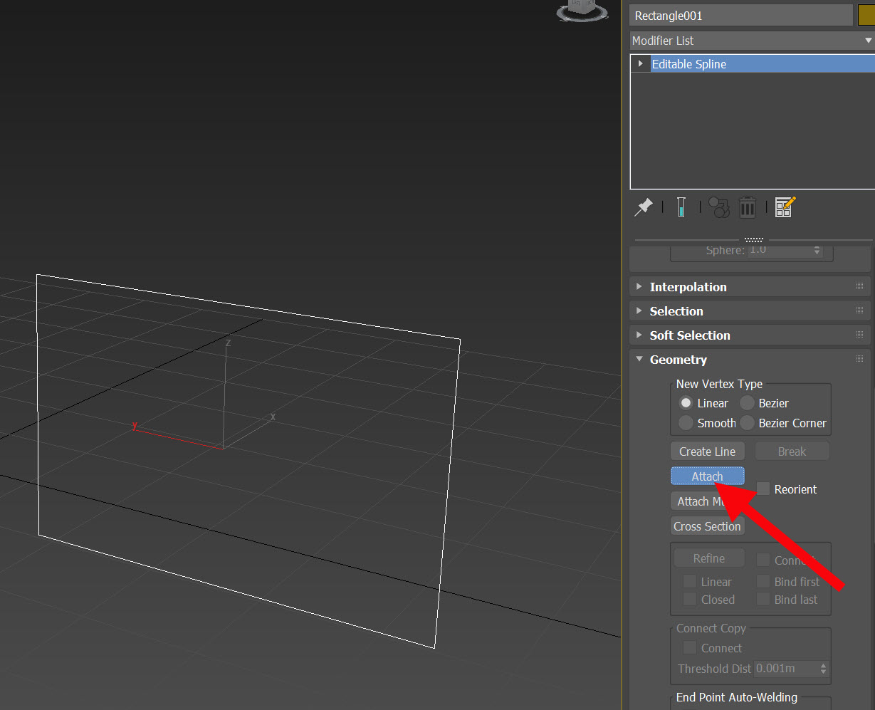 5)새로운 스플라인 오브젝트에서 attach를 선택하고 면 돌출이 비정상적인 스플라인을 클릭합니다.