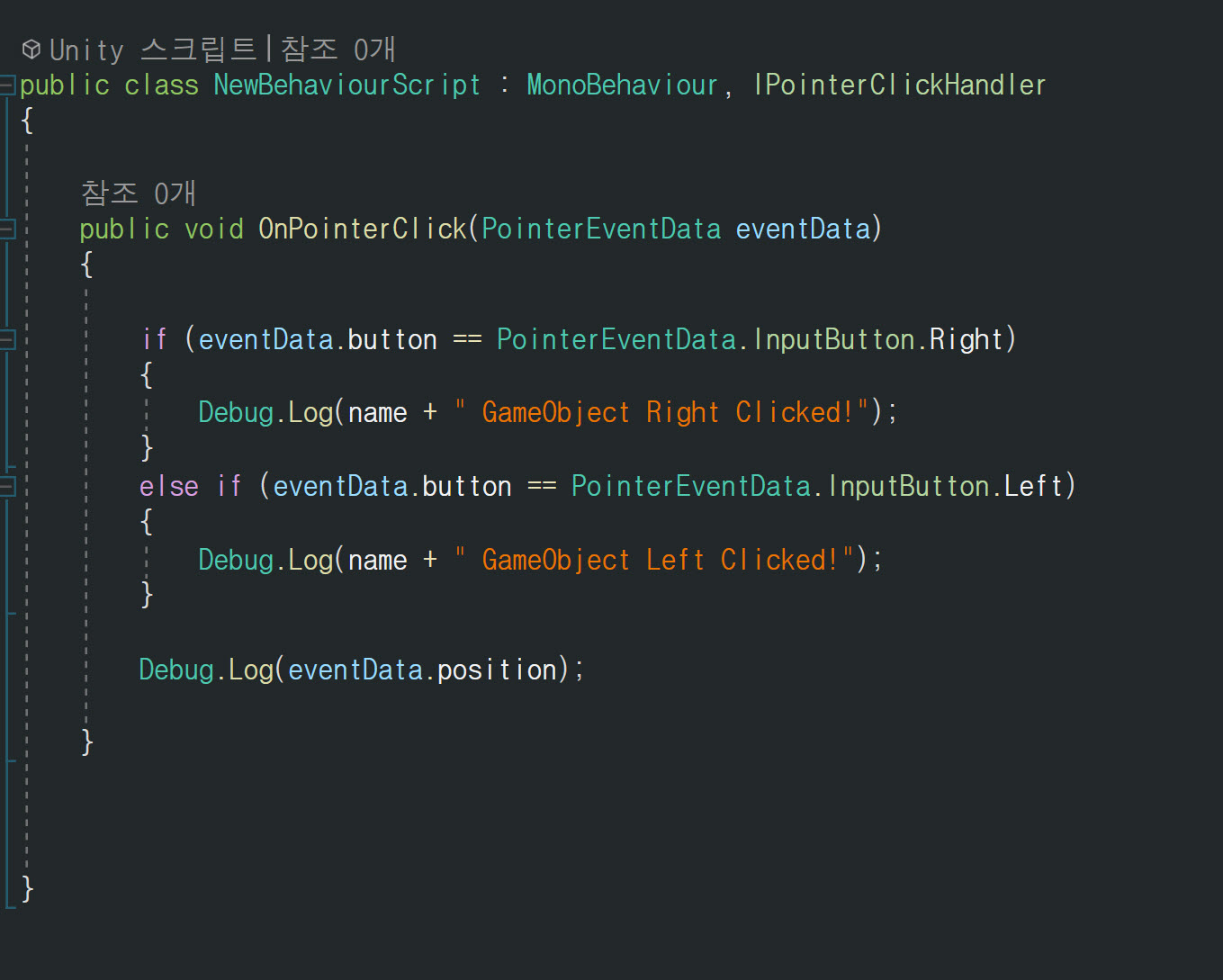 4)OnPointerClick 콜백을 수신하여 클릭 입력을 감지하려면 해당 오브젝트의 스크립트에서 EventSystems 네임스페이스를 추가하고 인터페이스(IPointerClickHandler) 상속 및 함수(OnPointerClick)를 구현합니다.