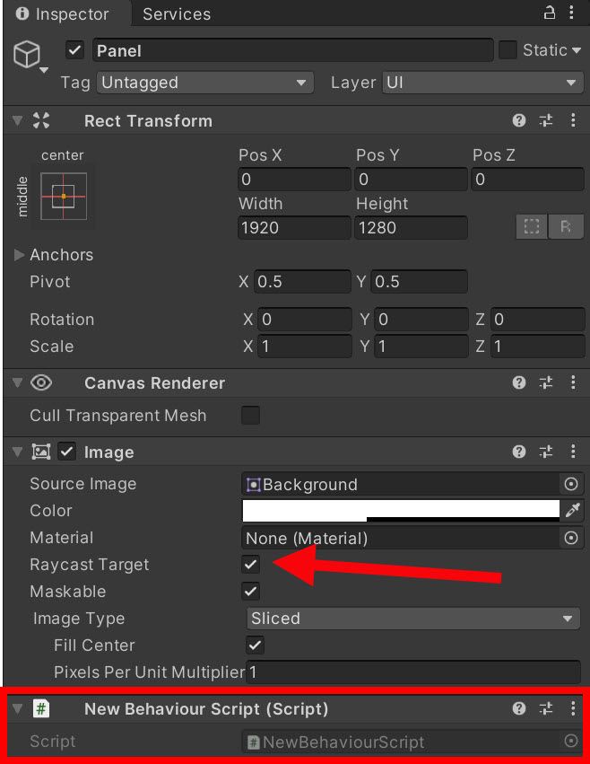 3)클릭 이벤트를 사용할 UI 게임오브젝트의 컴포넌트에서 raycast target 속성에 체크되어있는지 확인하고 새로운 스크립트를 추가합니다.
