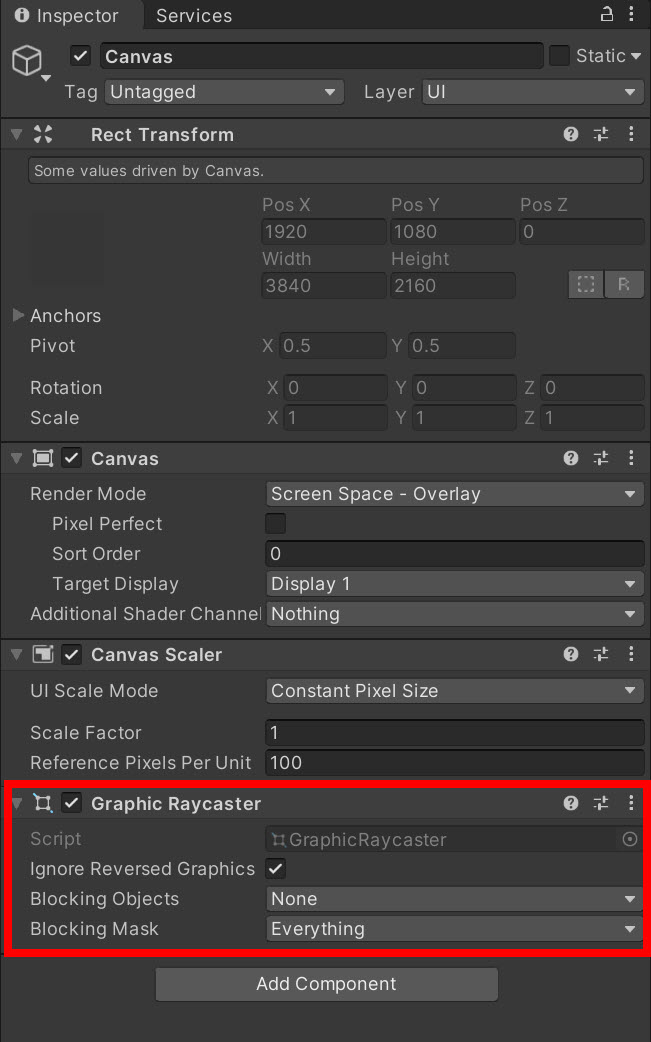 2)캔버스(Canvas) 오브젝트에 Graphic Raycaster 컴포넌트가 존재하는지 확인합니다.
