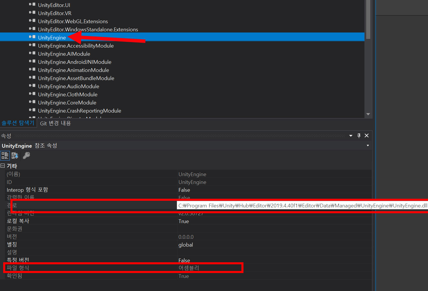 7)참조를 선택하면 해당 참조의 파일 형식(어셈블리)과 경로를 확인할수있습니다.