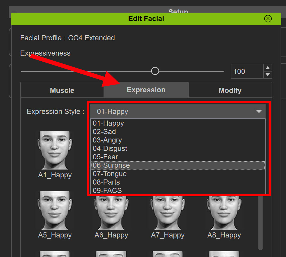 5)expression에서 몇가지 종류의 표정 스타일(expression stype)을 확인할수있습니다(happy, sad, angry, disgust, fear, surprise, tongue, parts, FACS)