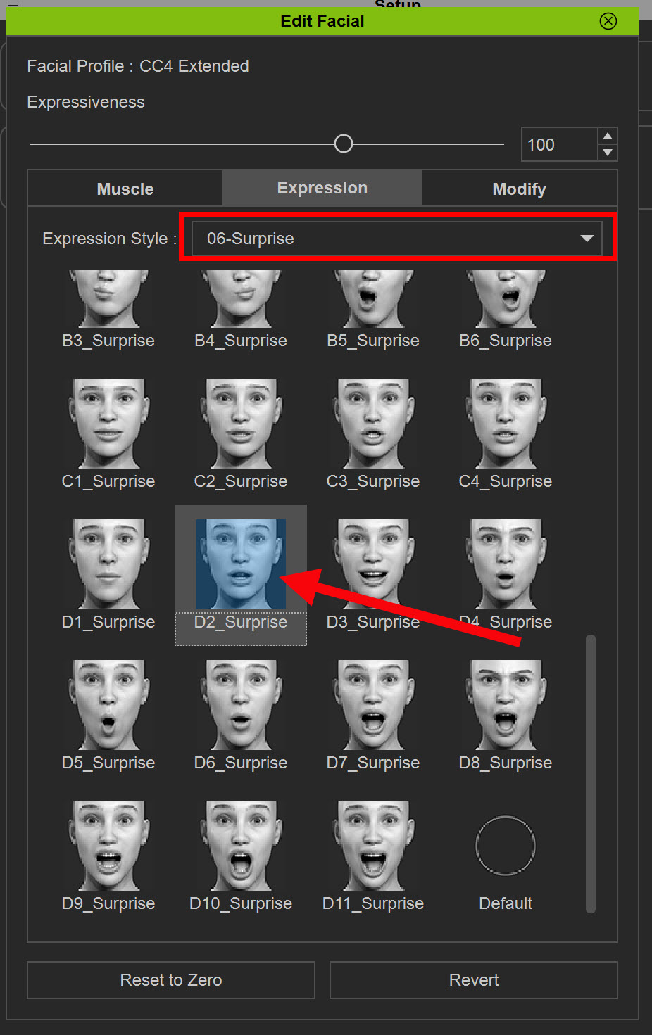 6)표정 스타일(surprise)을 선택하고 사전 설정된 얼굴 표정을 선택합니다.