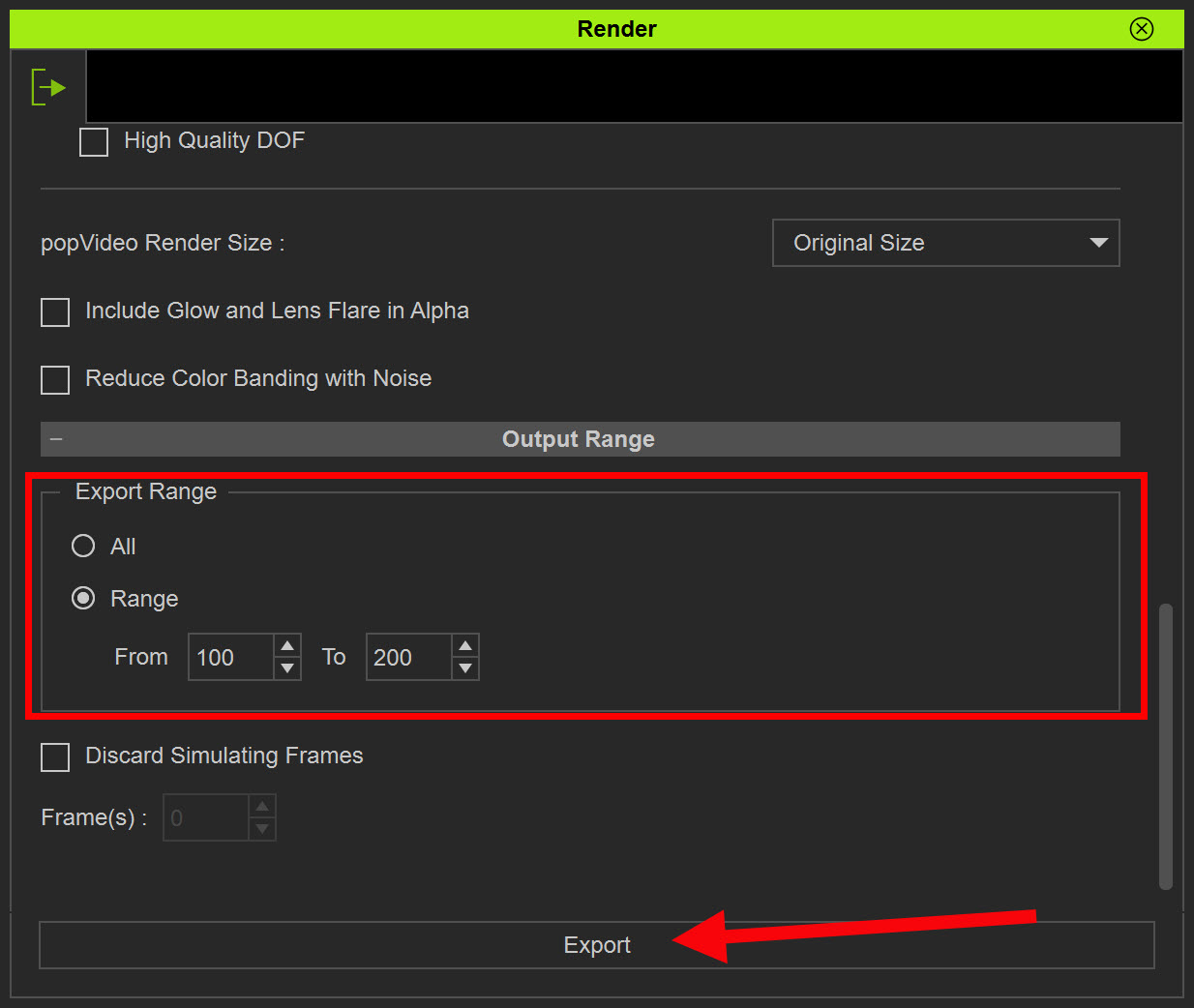 7)내보내기할 동영상의 범위를 설정합니다. 특정한 구간을 설정하려면 range에서 시작과 끝 프레임을 입력하고 export를 클릭합니다.