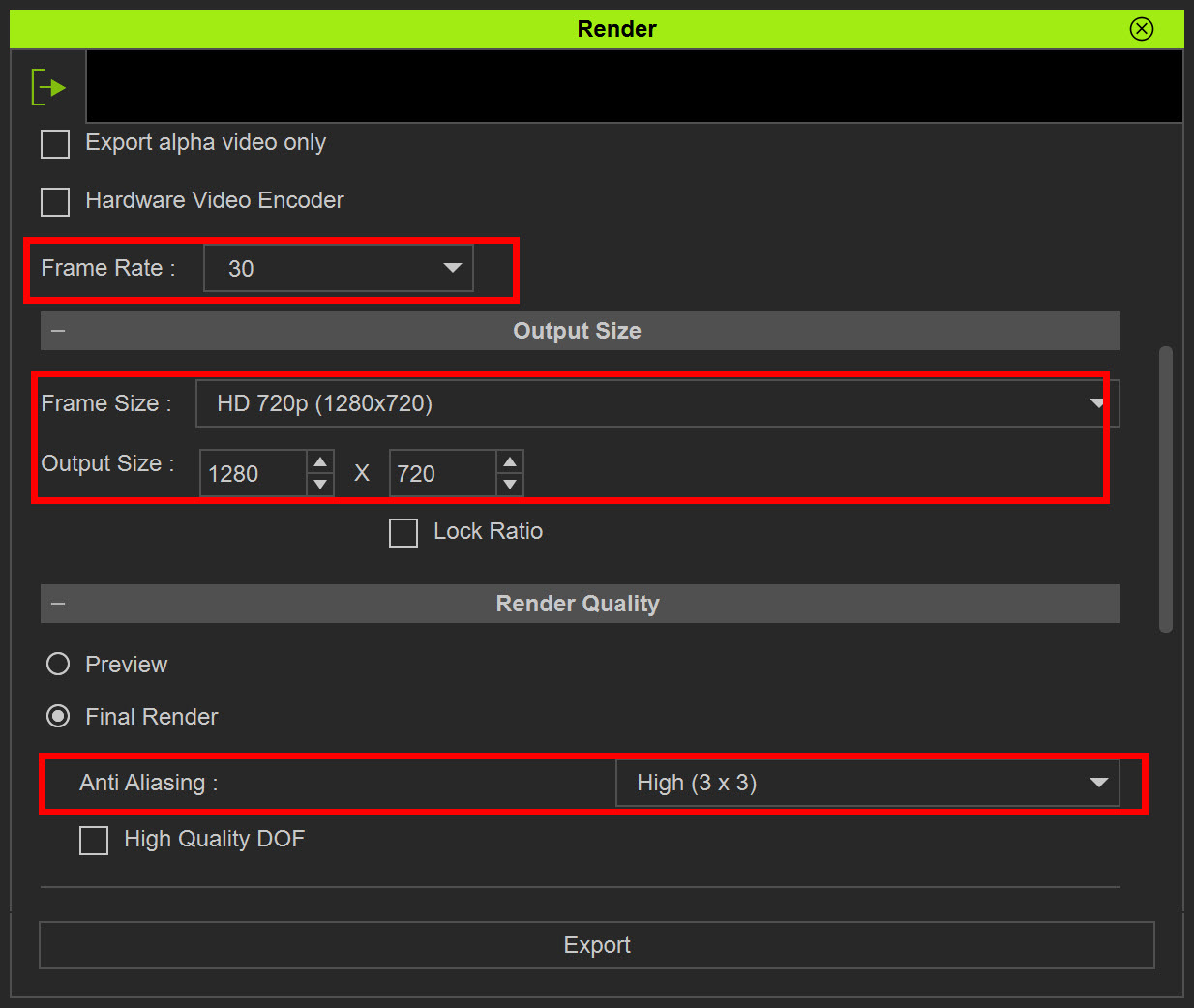 3)이미지 포맷(format), 렌더링 이미지 사이즈(output size), 렌더링 품질(render quality)을 설정하고 export를 클릭합니다.