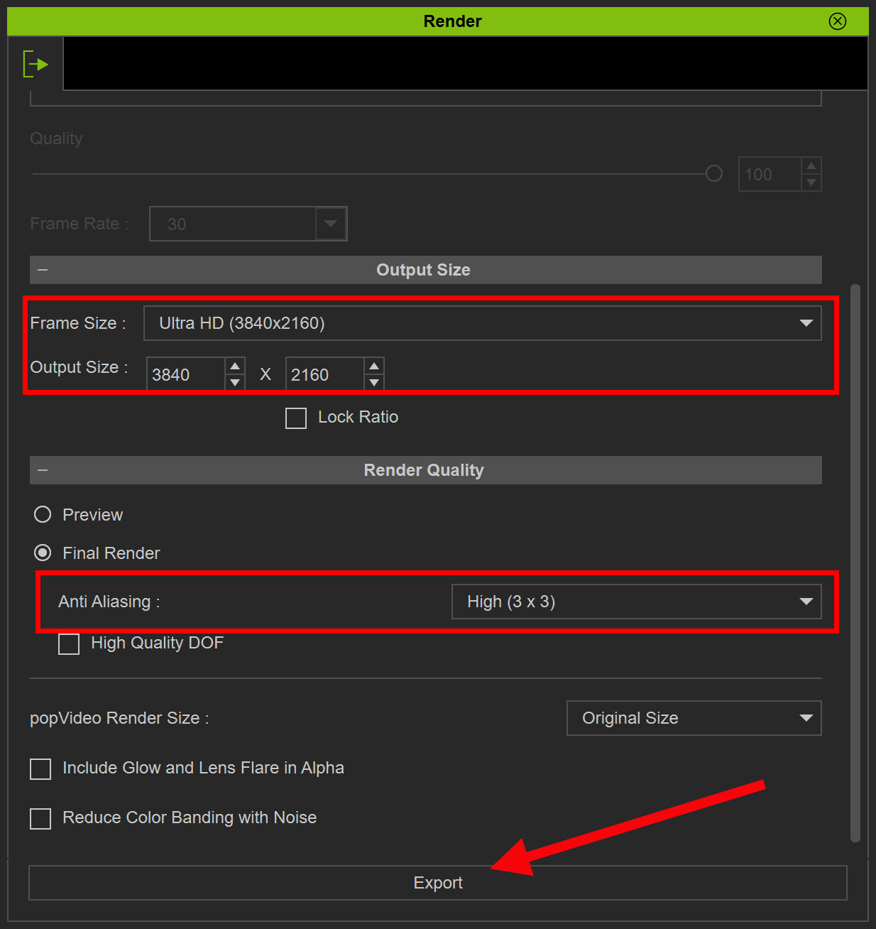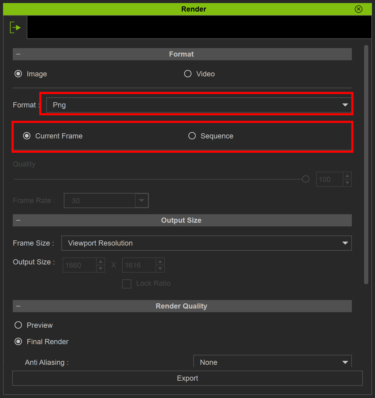 3)이미지 포맷(format), 렌더링 이미지 사이즈(output size), 렌더링 품질(render quality)을 설정하고 export를 클릭합니다.