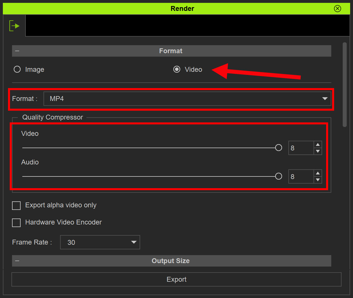 6)동영상의 포맷(format), 프레임레이트(framerate), 사이즈(output size), 렌더링 품질(render quality)를 설정합니다.