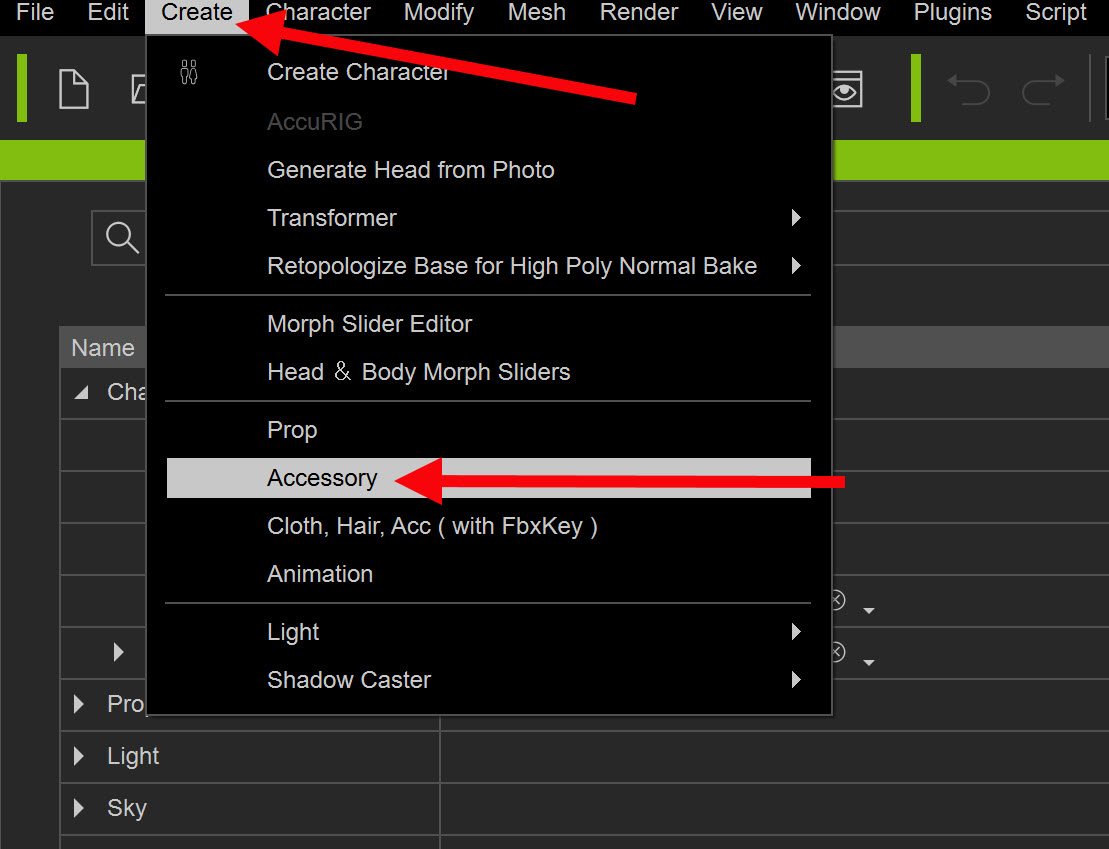 2)상단의 create 메뉴에서 accessory를 선택하고 3D 의상(obj, fbx)을 불러오기합니다.