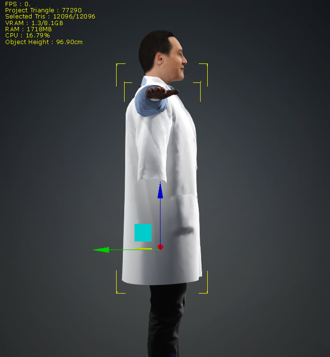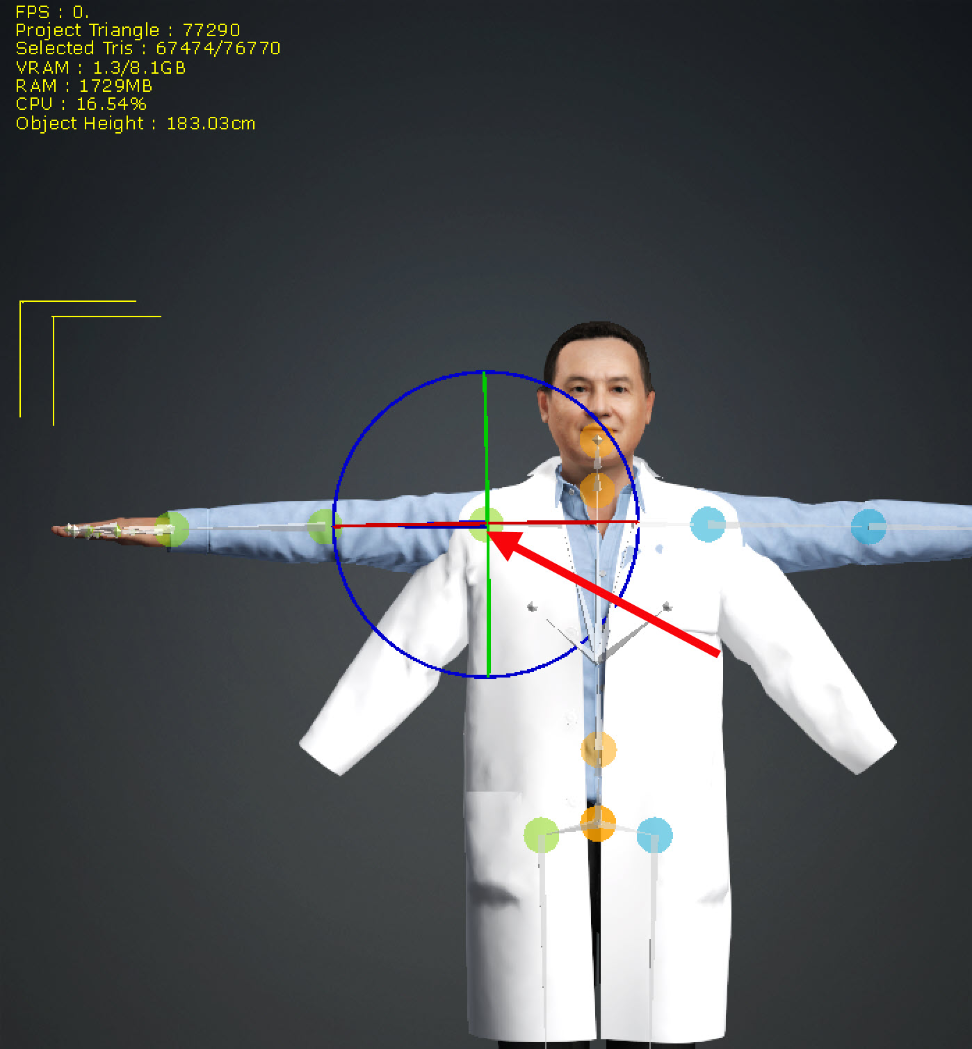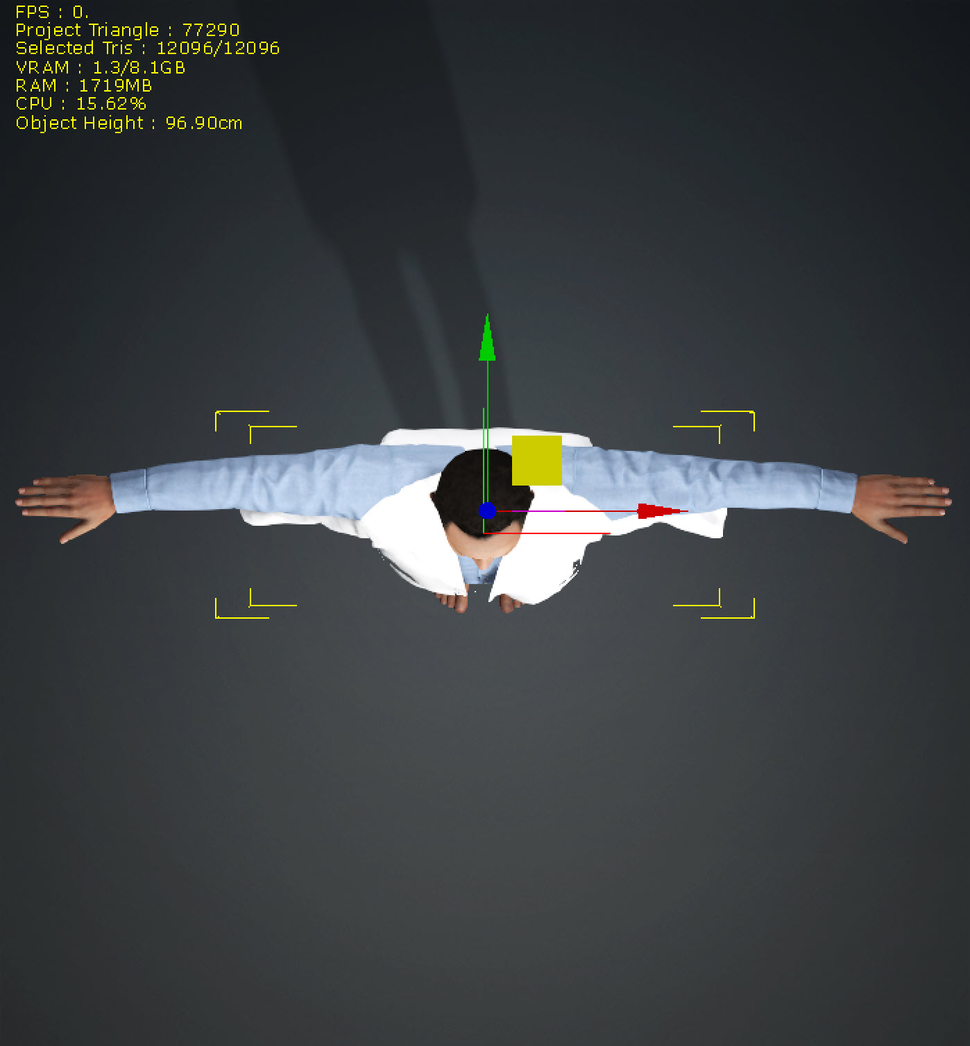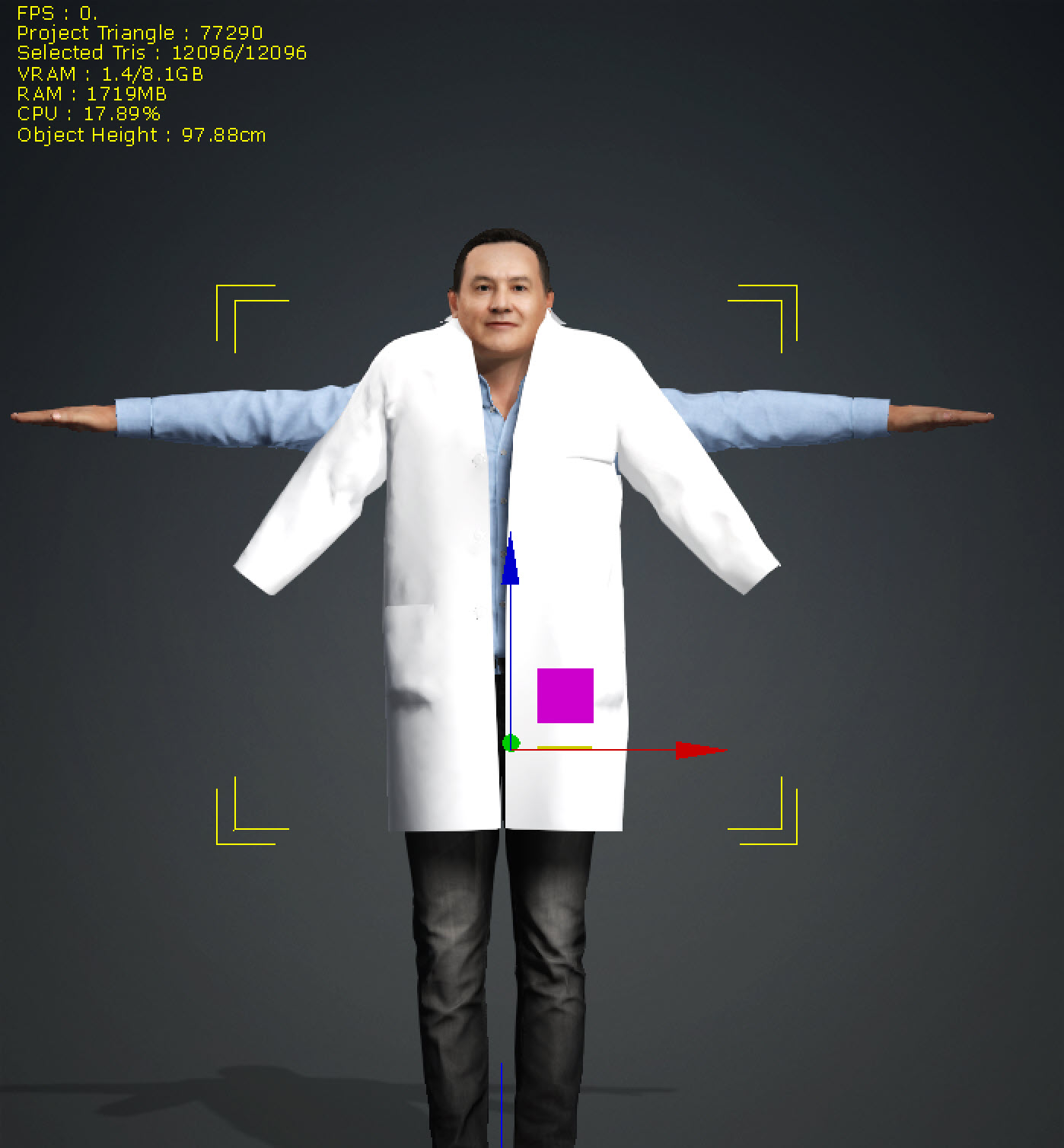 6)상단의 이동 및 크기 도구(move, scale tool)를 사용하여 의상 모델의 위치를 설정하고 크기를 조절합니다.