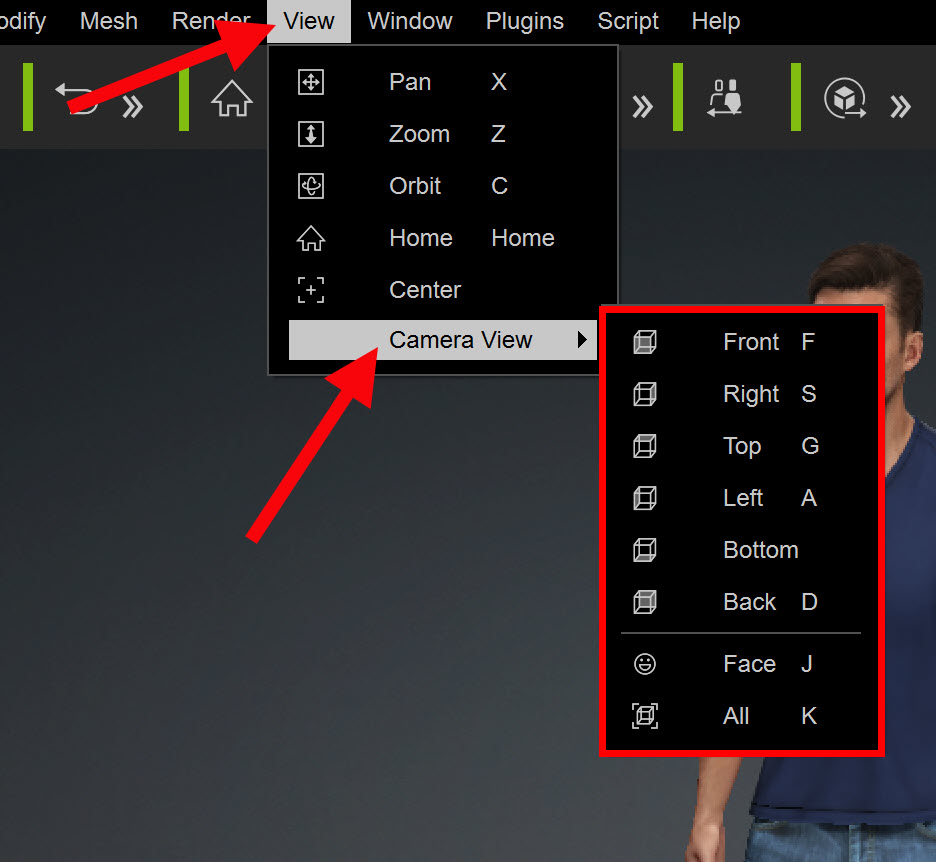 4)상단 view 메뉴의 camera view에서 카메라 뷰(Front)를 선택합니다.