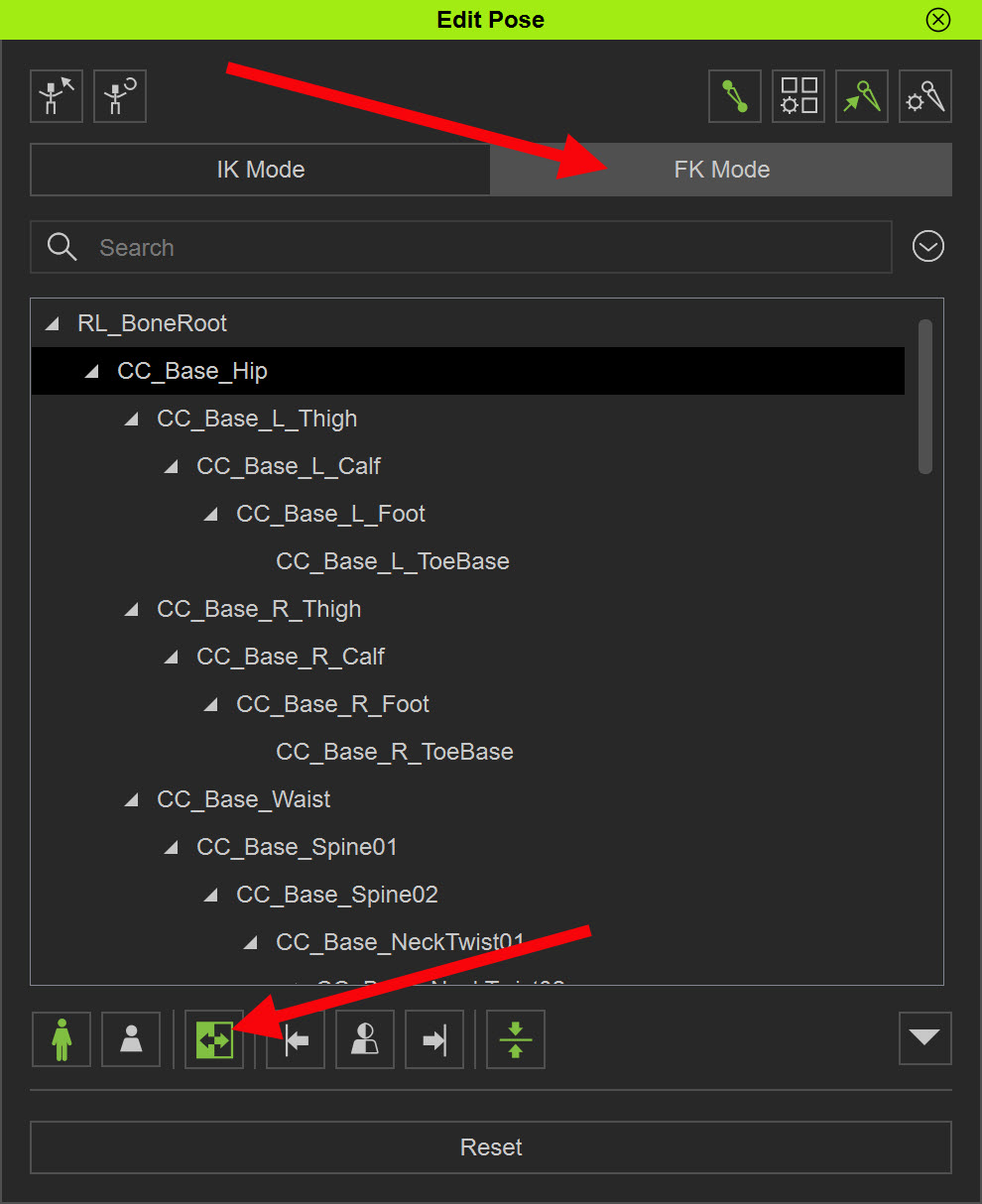 10)edit pose에서 FK Mode를 선택합니다. 하단에서 Mirror Control를 활성화하면 좌우대칭을 사용합니다.