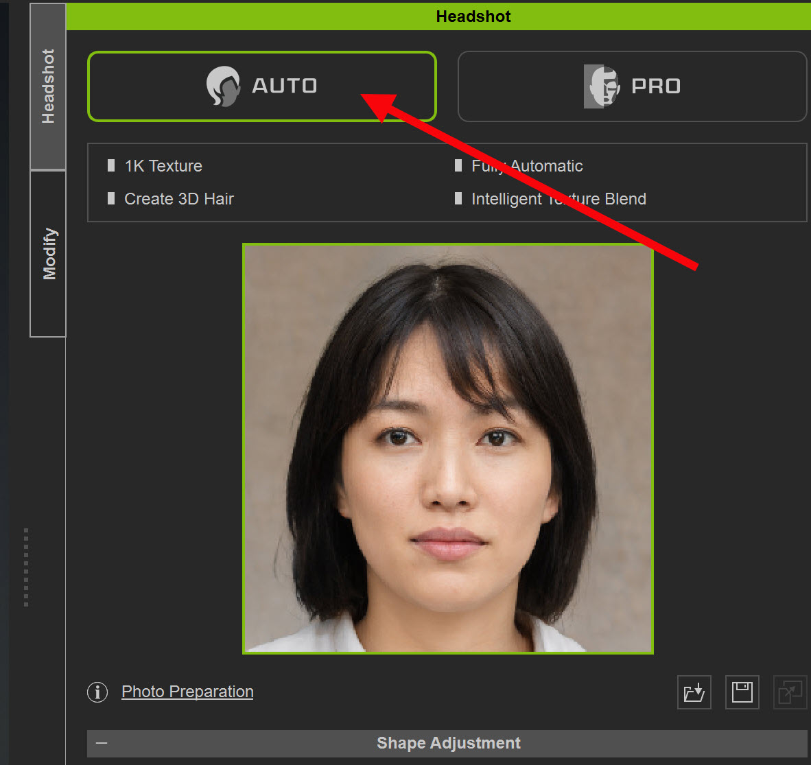 1)자동 모드를 사용하여 3D 얼굴을 생성하려면 헤드샷에서 AUTO를 선택합니다.