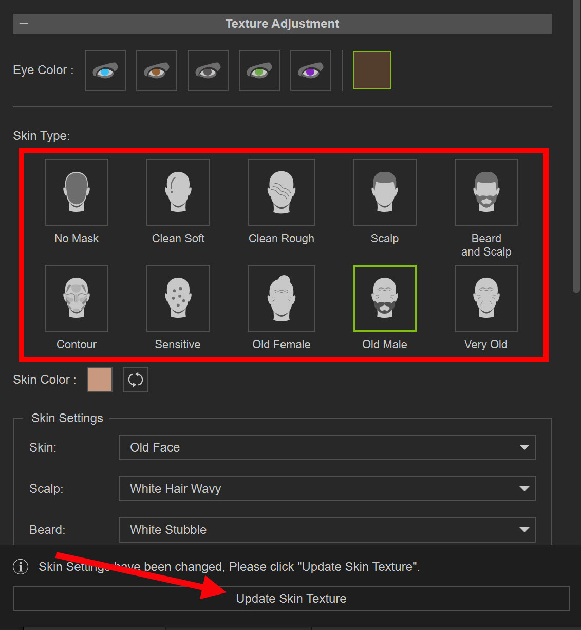 2)얼굴의 노화를 표현하려면 헤드샷의 texture adjustment에서 스킨타입(skin type)을 old male(old female) 또는 very old로 변경하고 업데이트합니다(update skin texture)