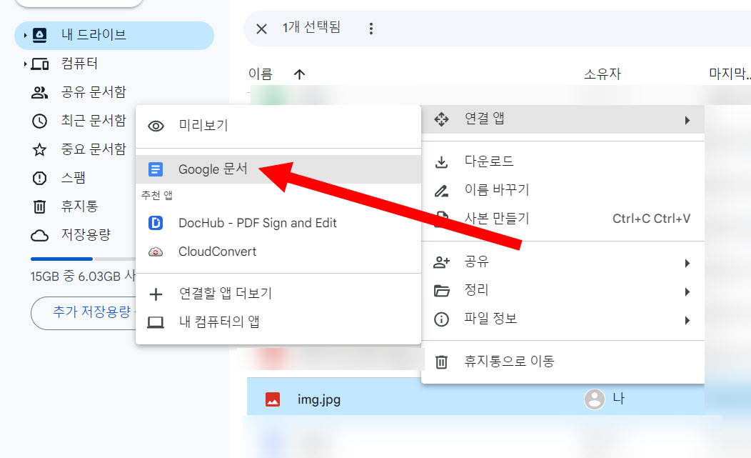 3)업로드한 이미지파일을 선택하고 마우스 우클릭한후 연결 앱의 google 문서를 선택합니다.