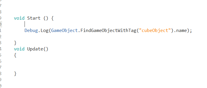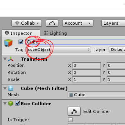 예에서 cubeObject 태그로 지정된 게임오브젝트의 이름을 출력합니다 (Cube)
