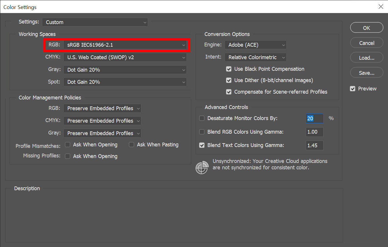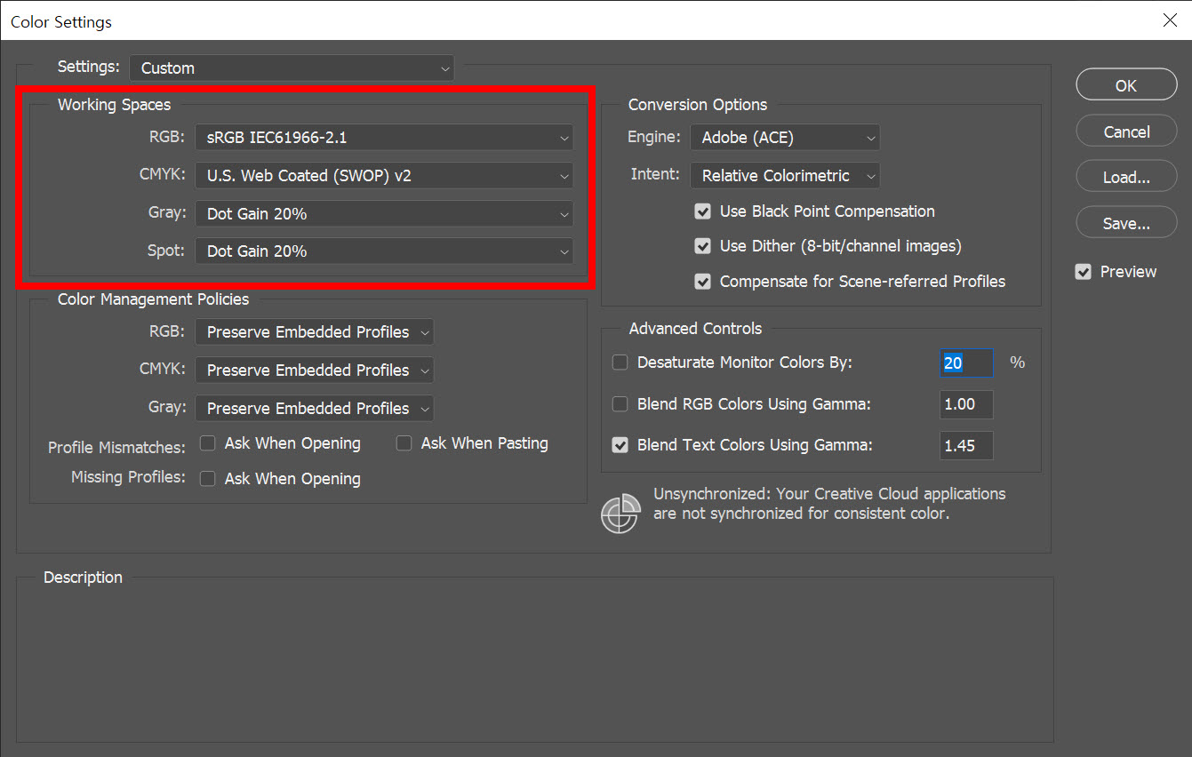 2)working spaces에서 현재 포토샵에서 사용중인 색 공간을 확인할수있습니다.