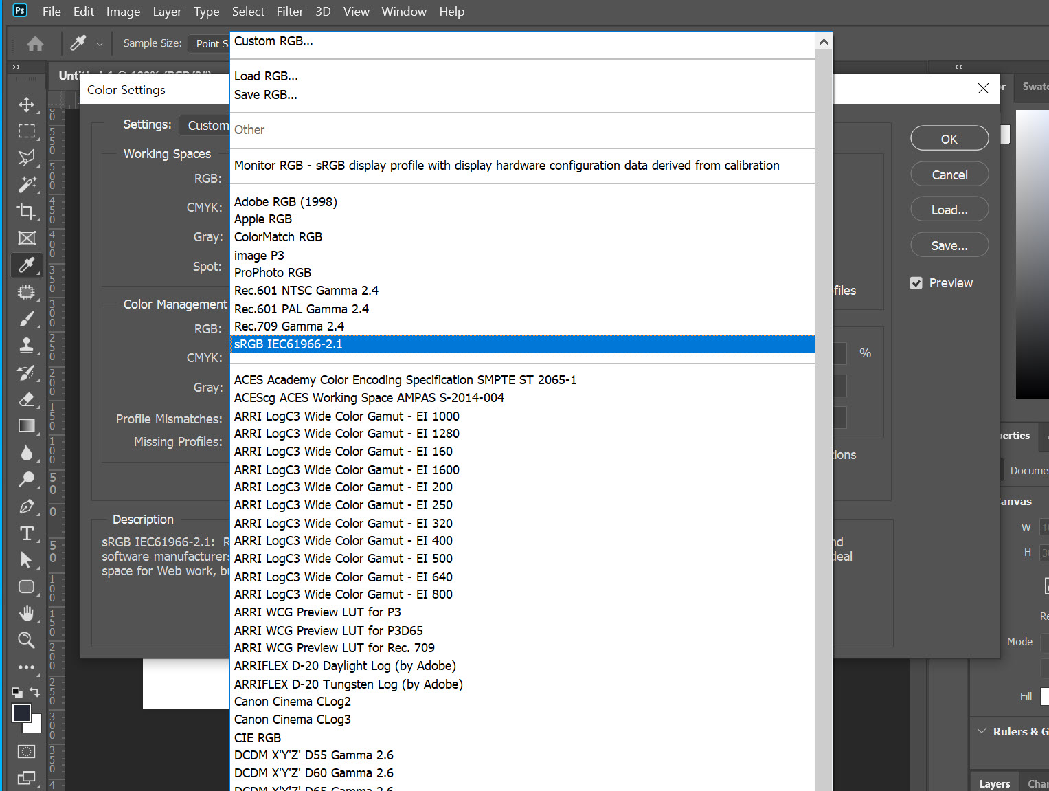 3)RGB 색상 모델에 사용중인 색 공간(color space)이 기본 sRGB IEC61966-2.1로 설정되어있는것을 확인할수있습니다.
