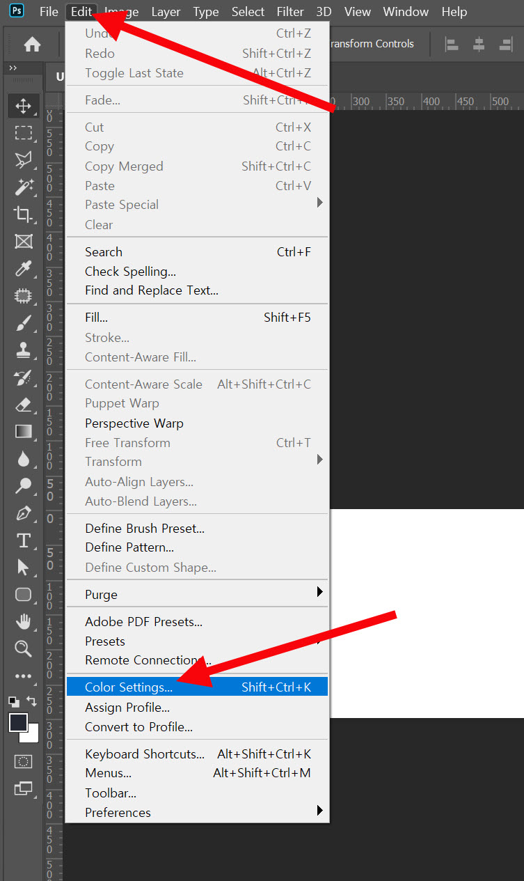 1)상단 edit 메뉴의 color settings로 이동합니다.