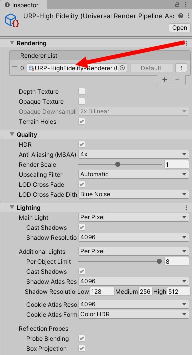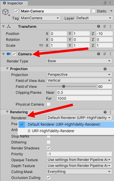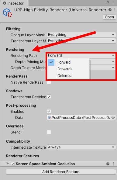 렌더러의 rendering에서 렌더링 패스(rendering path)를 설정합니다. URP는 포워드 렌더링 패스가 기본으로 설정되어있습니다(Forward)