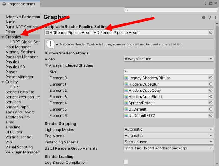 프로젝트 설정의 graphics에서 현재 사용중인 HDRP 에셋으로 이동합니다(HD render pipeline asset)