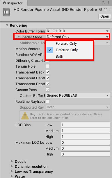 HDRP 에셋의 rendering에서 렌더링 패스를 선택합니다. HDRP는 디퍼드 렌더링 패스가 기본으로 설정되어있습니다(Deferred)