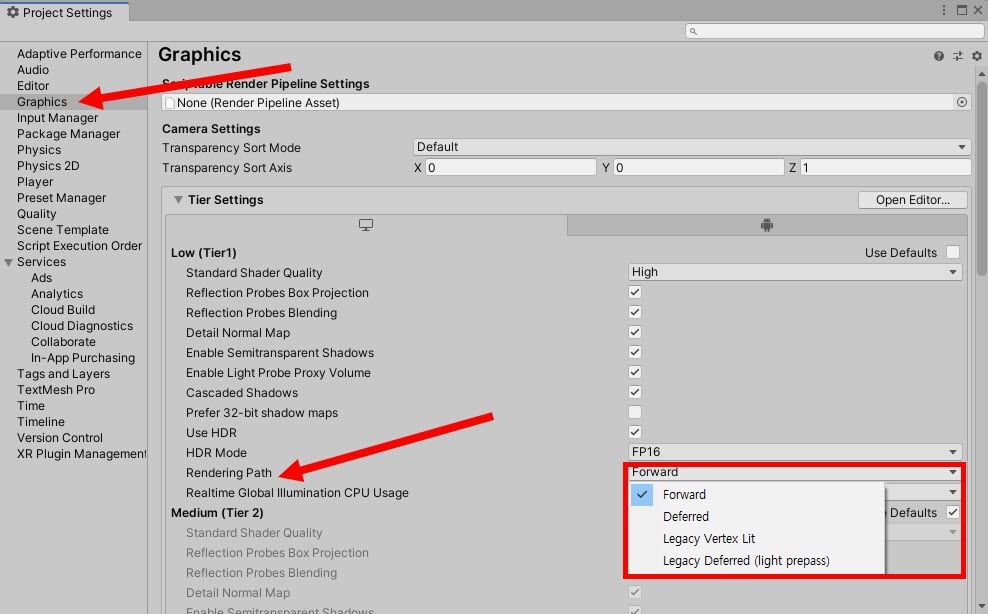 프로젝트 설정의 graphics에서 tier settings의 렌더링 패스를 선택할수있습니다. 빌트인 렌더파이프라인은 포워드 렌더링 패스가 기본으로 설정되어있습니다(Forward)