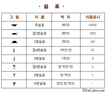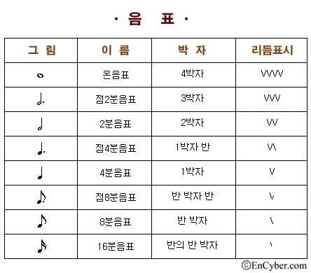 (온음표, 2분음표, 4분음표, 8분음표, 16분음표, 기타)