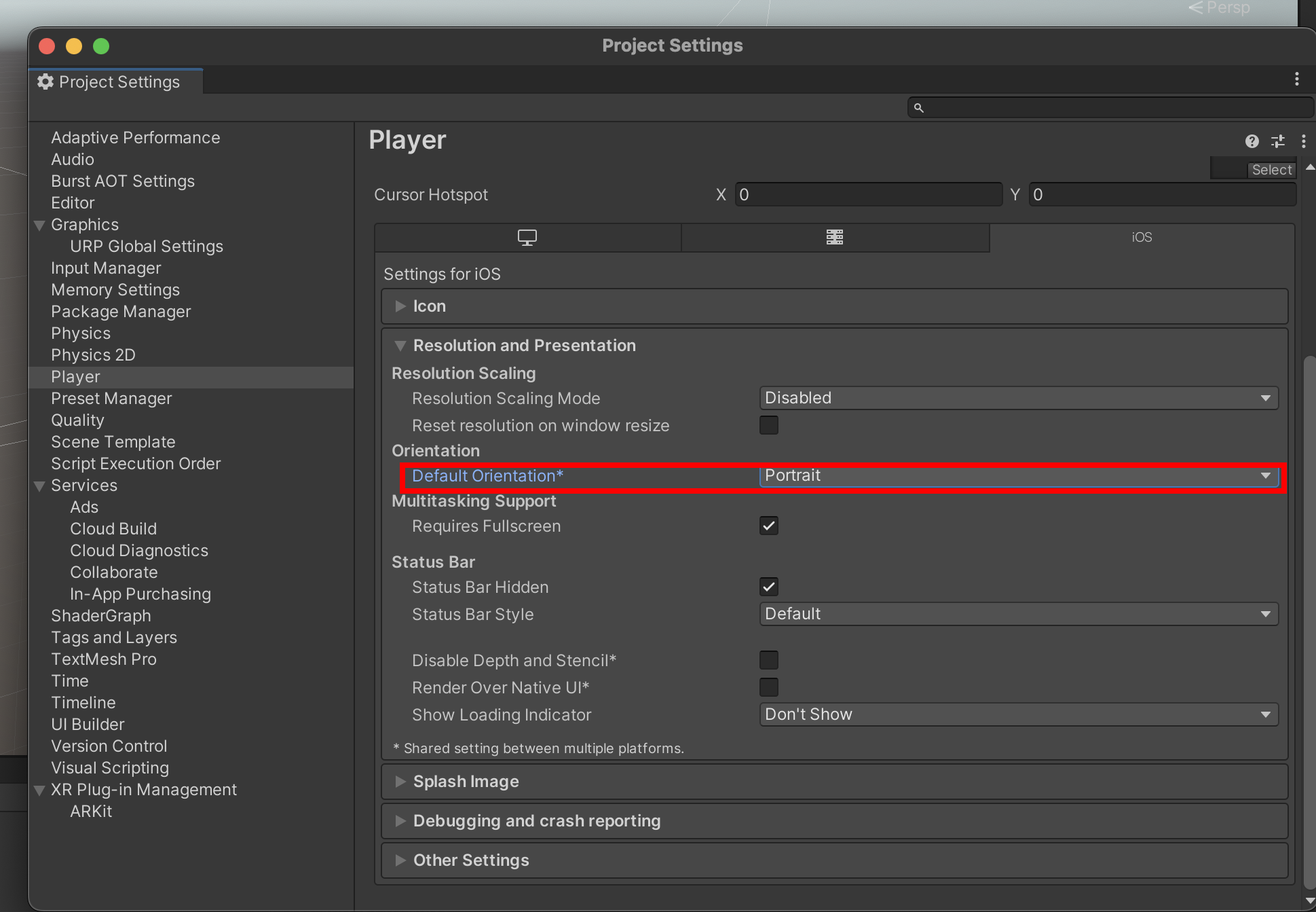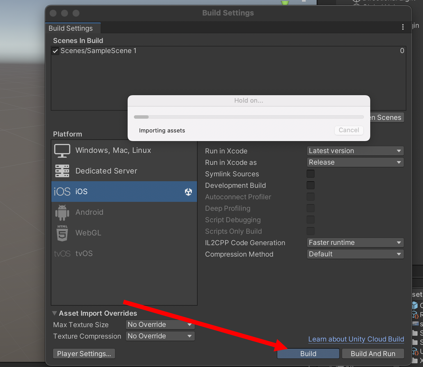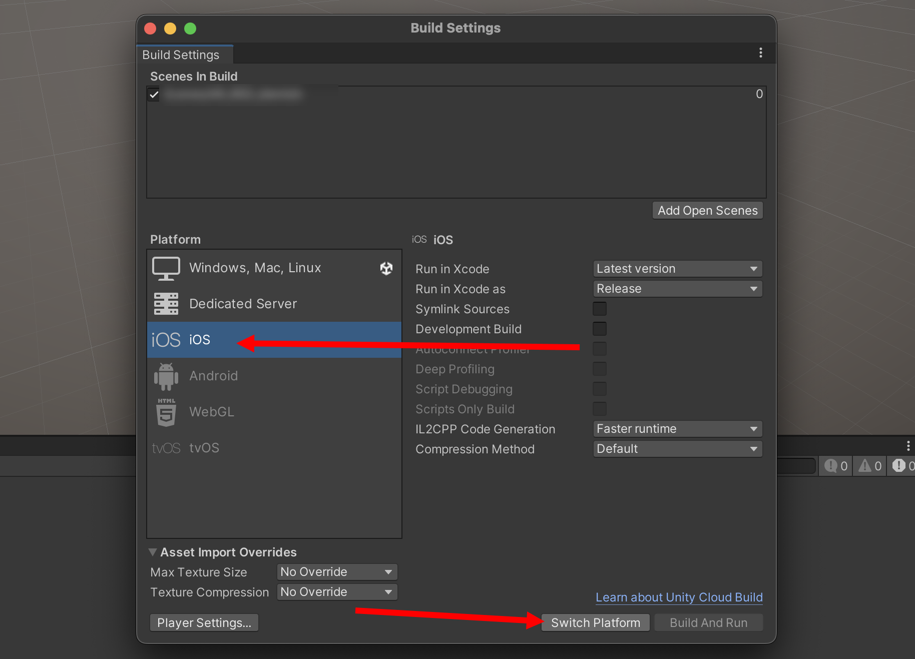 1)빌드 설정(build settings)에서 프로젝트의 플래폼을 iOS로 전환합니다(switch platform)