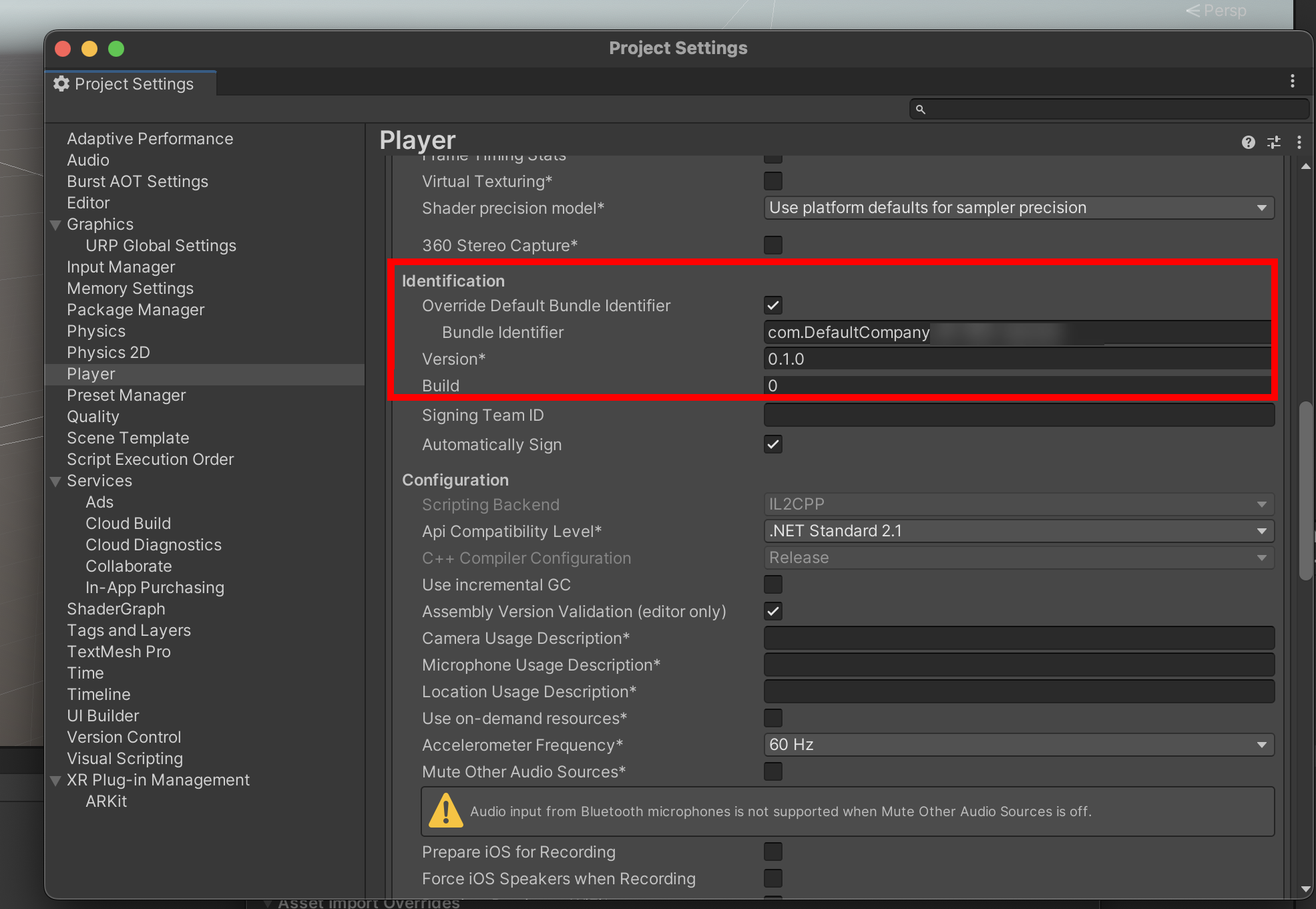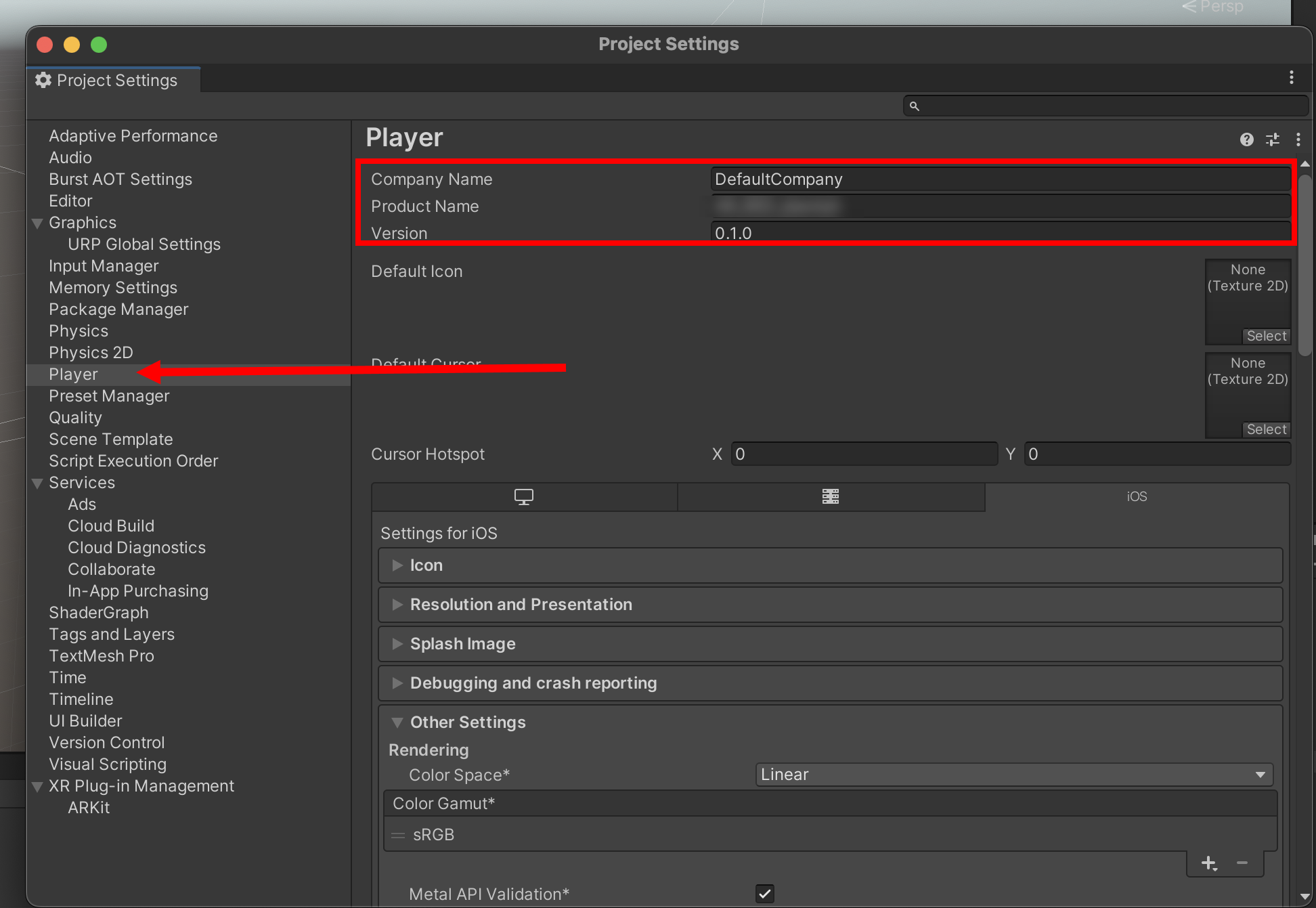 6)Player에서 company name, product name, version을 입력합니다.