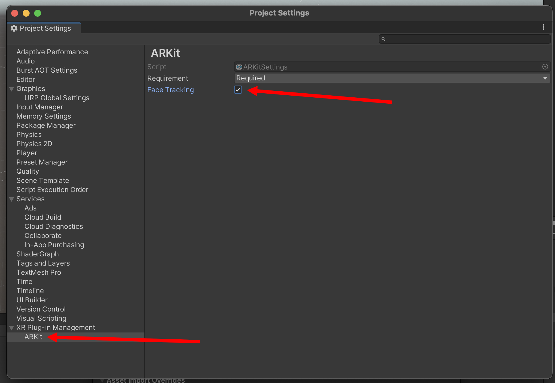5)얼굴 추적 기능을 사용할 경우 ARKit의 Face Tracking에 체크합니다.