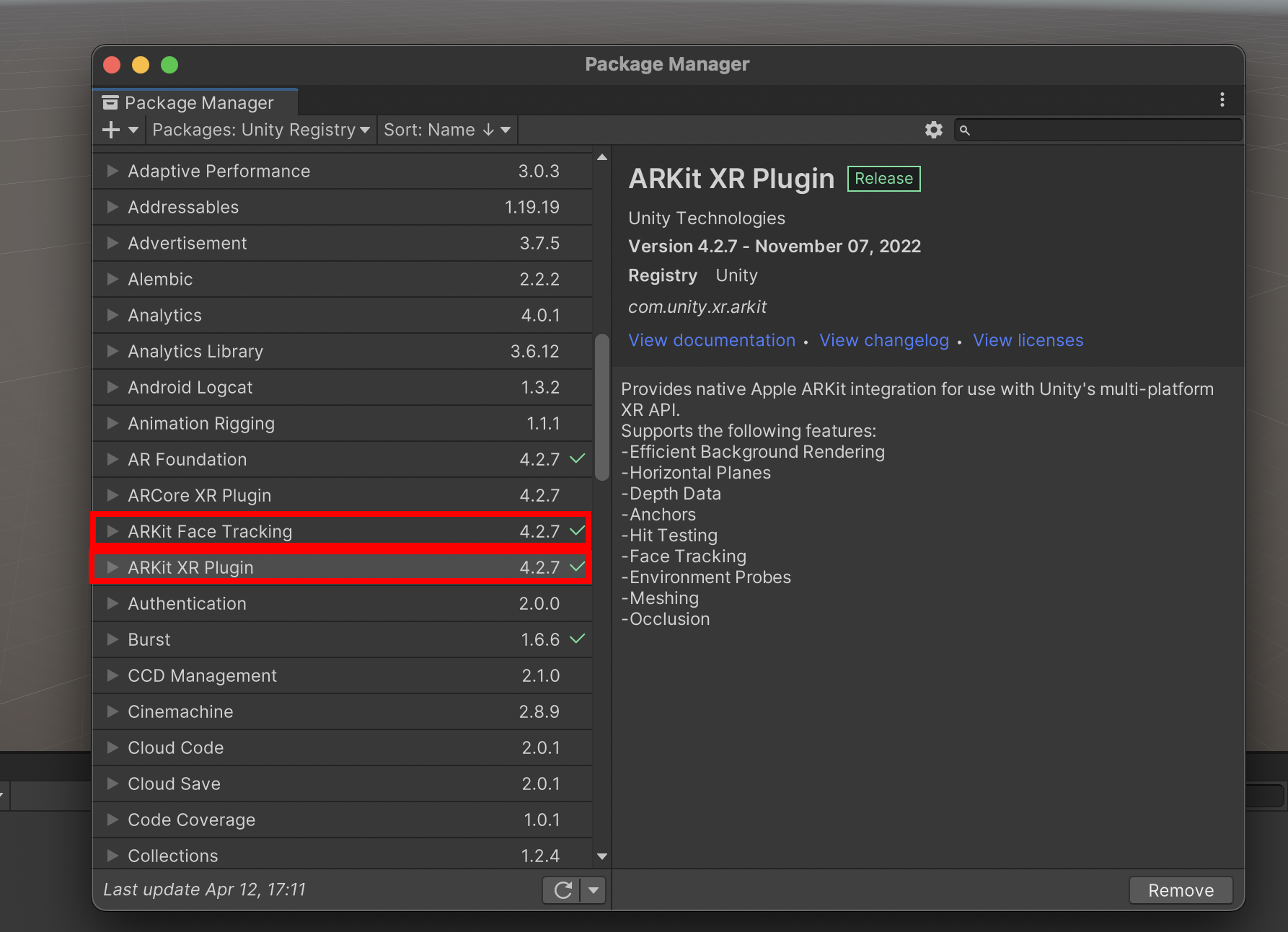 2)패키지 관리자(package manager)에서 ARKit XR Plugin 패키지를 설치합니다(얼굴 추적 기능을 사용할 경우 ARKit Face Tracking 패키지를 추가 설치합니다)