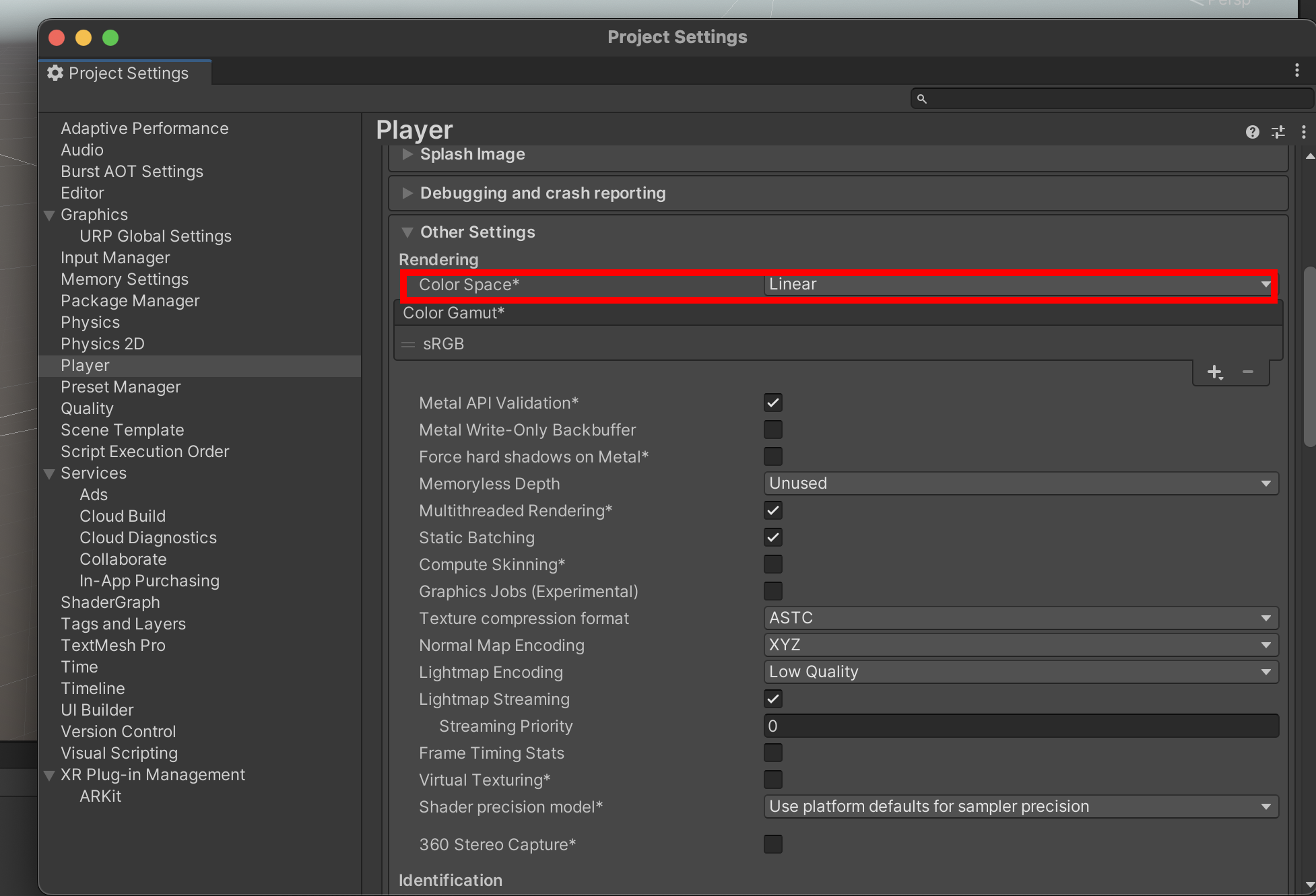 8)other settings에서 색상 공간(color space)이 linear로 설정되어있는지 확인합니다.