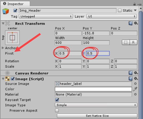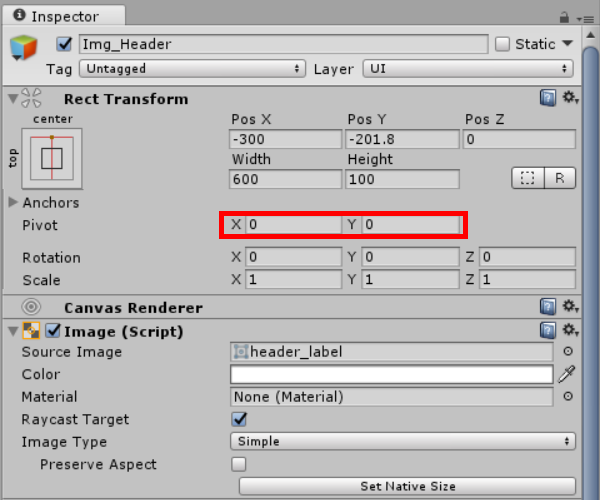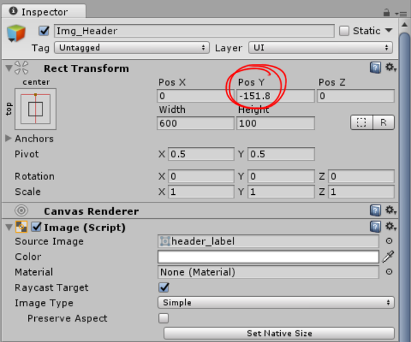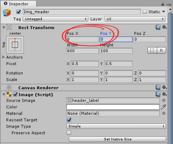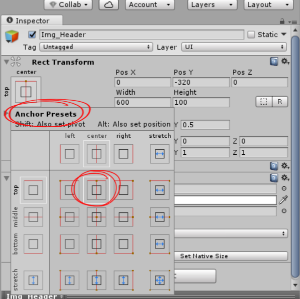 3)앵커 프리셋을 top, center로 변경합니다. posY에서 오브젝트가