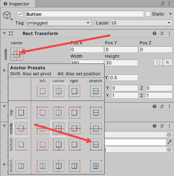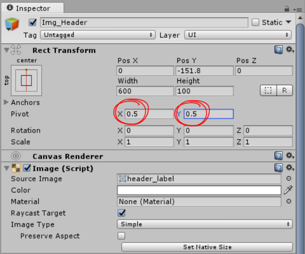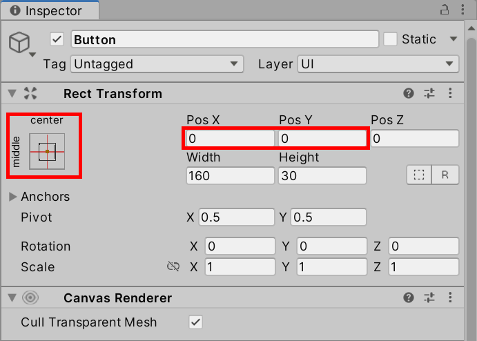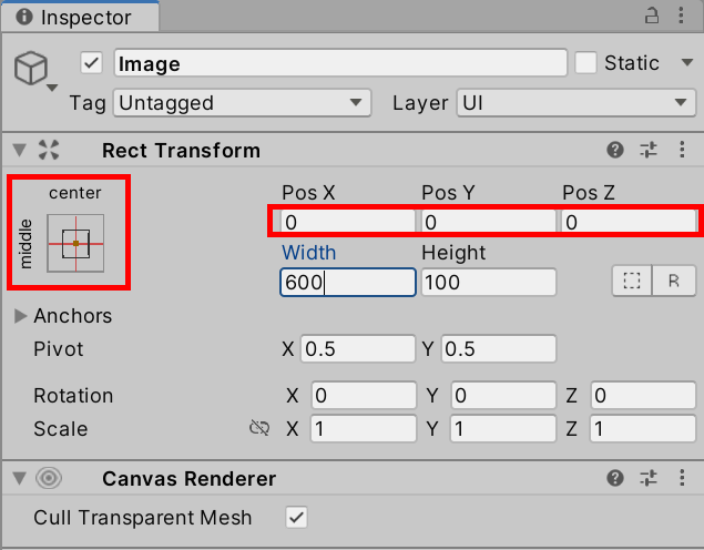 2)Rect Transform에서 앵커 프리셋(anchor presets)이 기본값 middle, center로 설정되어있는것을 확인할수있습니다.