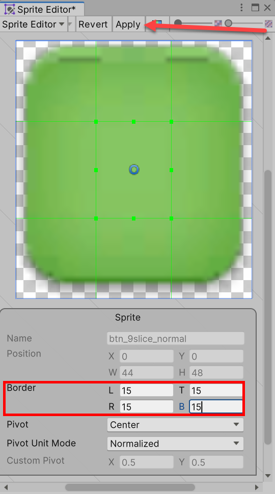 14)스프라이트 편집기에서 경계(Border)를 설정하고 적용합니다(apply)