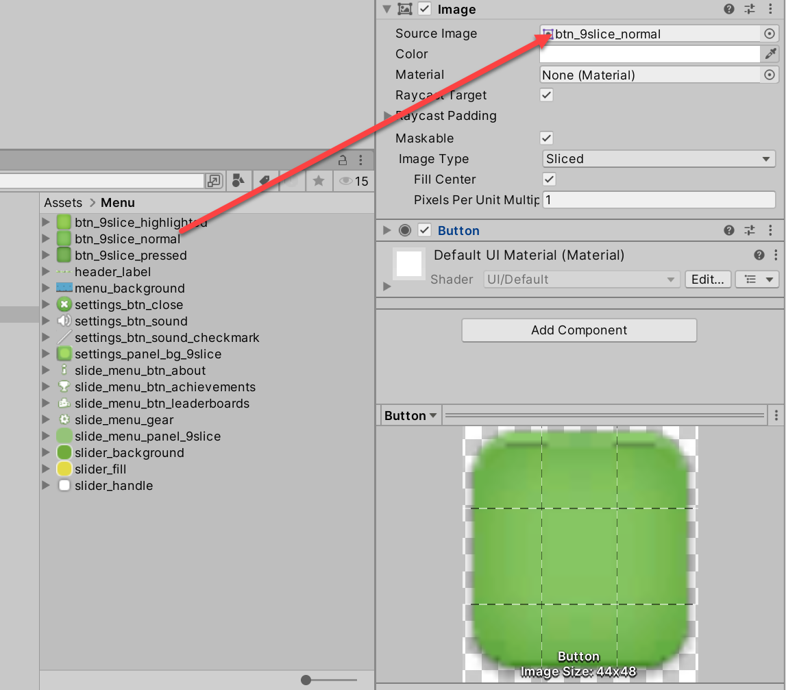 12)버튼 오브젝트의 소스 이미지로 사용할 스프라이트를 선택합니다.