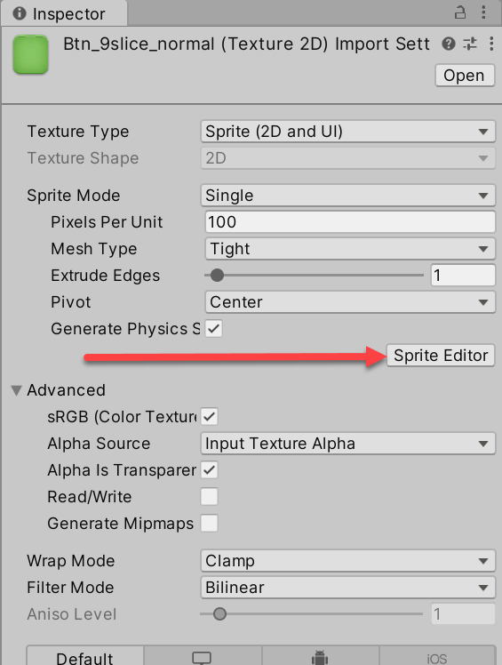 13)import settings에서 스프라이트 편집기(sprite editor) 로 이동합니다.