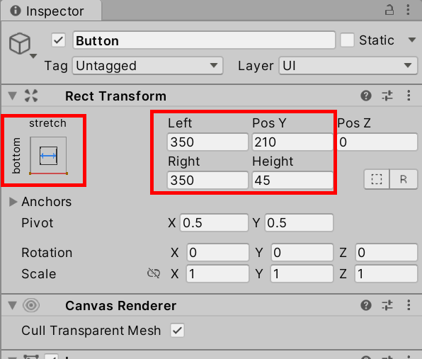17)버튼 오브젝트의 앵커 프리셋을 bottom, stretch로 설정합니다.