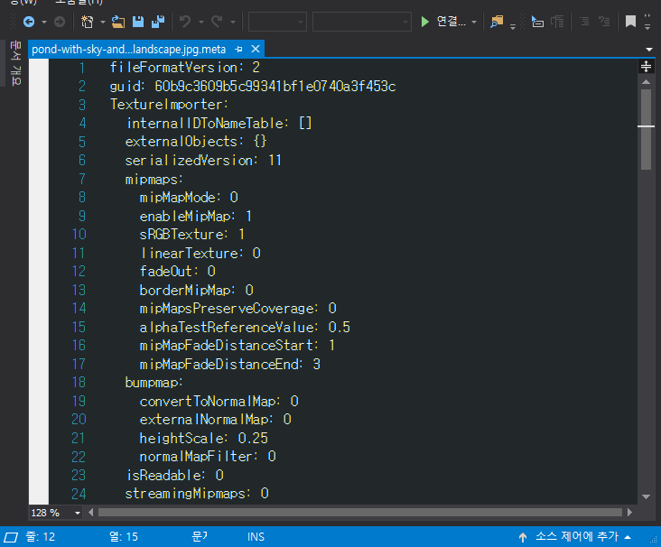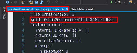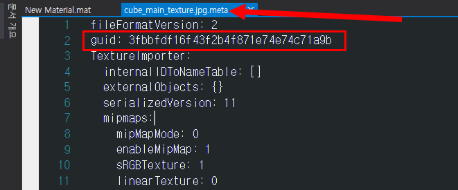 3)메타파일에서 텍스처 에셋에 할당된 고유의 ID(guid)를 확인할수있다. guid(Globally Unique Identifier)는 32 자리 16 진수 문자열을 사용하여 프로젝트 내의 에셋을 식별한다.