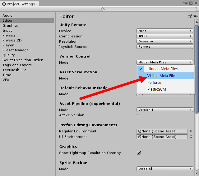 윈도우 탐색기의 프로젝트 폴더에서 메타파일을 표시하려면 프로젝트 세팅(project settings)의 editor로 이동한다. version control에서 visible meta files를 선택한다(유니티 최신버전에서는 이 옵션을 기본설정으로 사용한다)