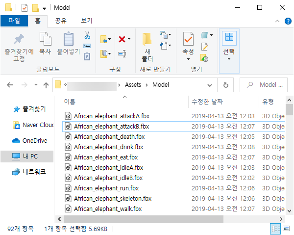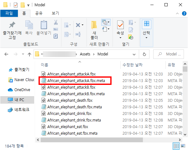 에셋에 대응하는 메타파일이 표시되는것을 확인할수있다. 메타 파일은 해당 에셋의 이름의 뒤에 .meta가 추가된다(model.fbx, model.fbx.meta)